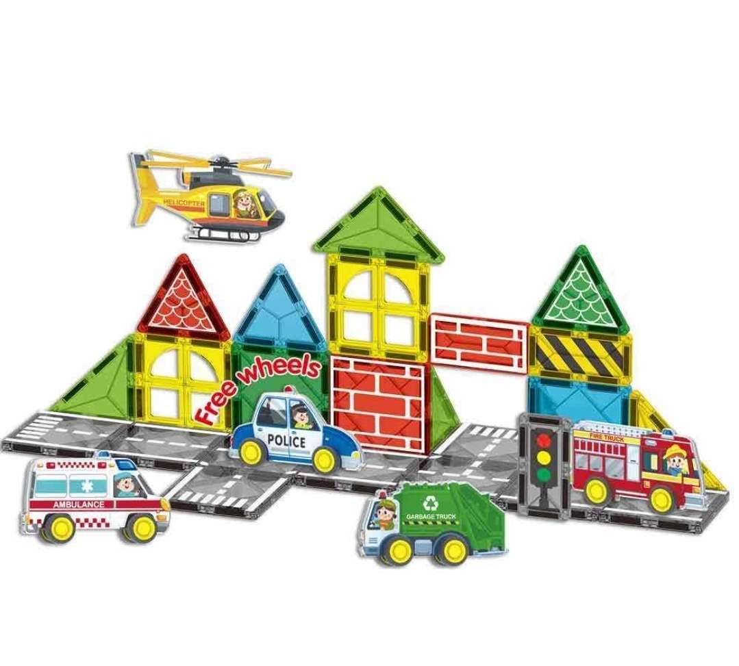 Imagine your little ones building their very own town, complete with vehicles like a police car, fire engine, garbage truck, ambulance, and helicopter—all brought to life through their creativity! These magnetic tiles are not just fun; they also help develop essential skills such as fine motor coordination, creative thinking, and a love for STEAM learning. Children will explore concepts of balance, symmetry, and construction during their playtime.