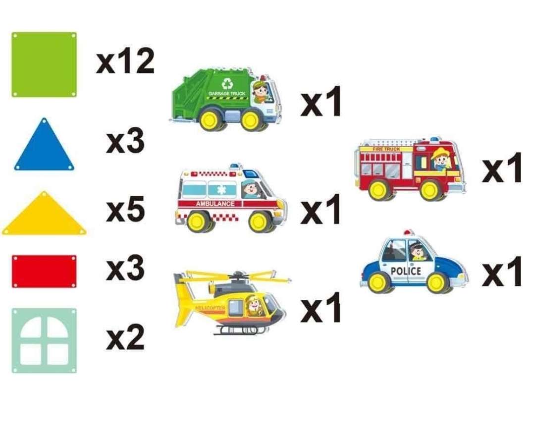 Features: 5 x vehicles (police, ambulance, fire, garbage and helicopter) + 25 x additional block pieces set up (refer to product picture for specifics)