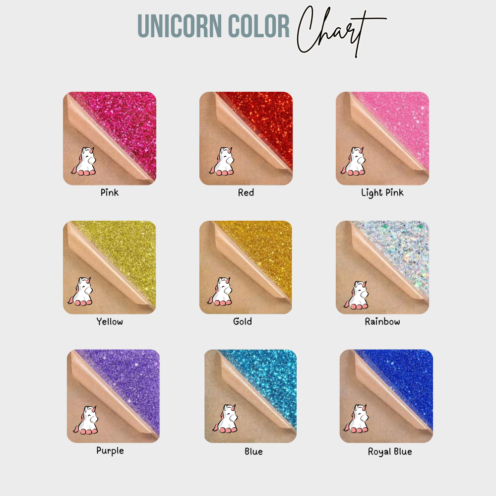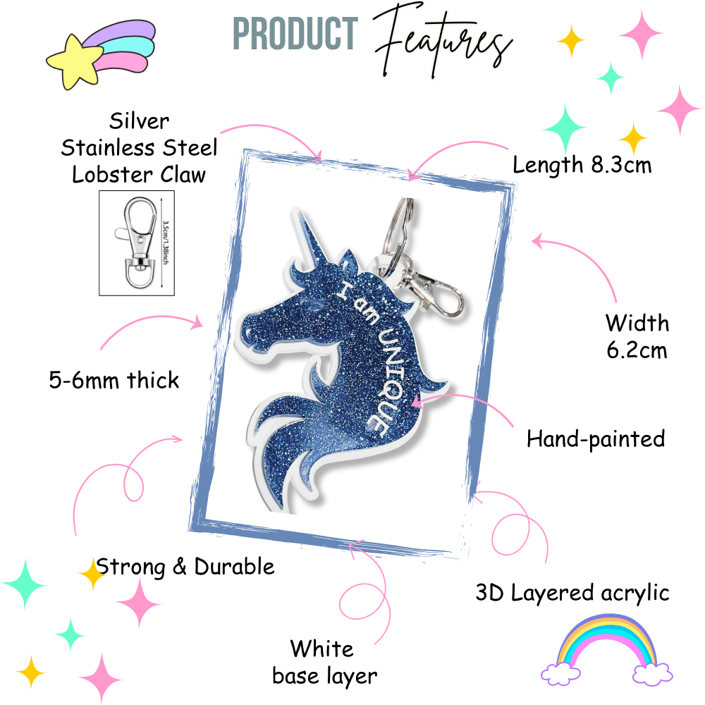 This dreamy tag is made from two layers of durable acrylic, creating a bold, eye-catching design that’s built to last through busy school runs, sports days, and sleepovers. The base color is white and the top layer features a gorgeous unicorn in a beautiful glitter color, of your choice, that shimmer and dance in the light like a pocketful of stardust.