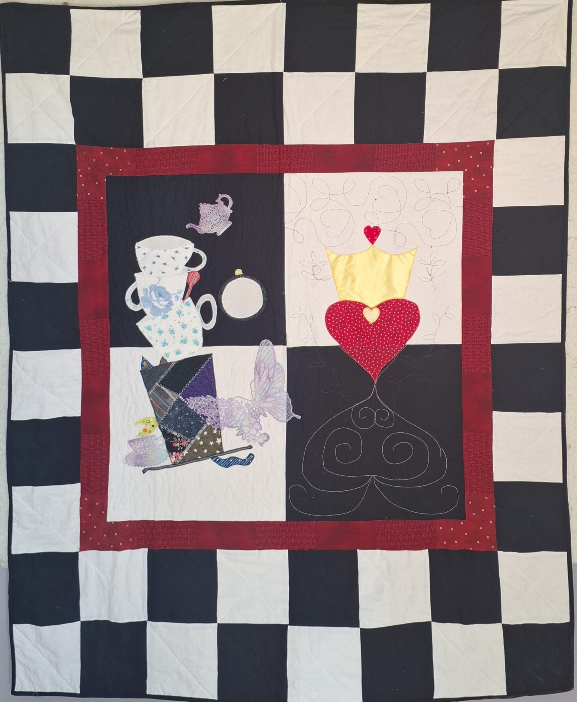 Unique quilt design. Quilt based on an interpretation of Alice in wonderland. It has a mix of applique and quilting. Showing all the iconic characters from the iconic story. Bold Colours and designs.