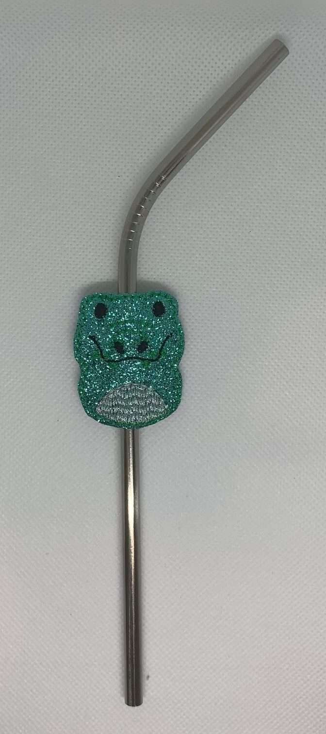Alligator straw hugger or topper. Embroidered onto vinyl or faux leather. The straw fits through the gaps top and bottom between the front and back of the hugger so once the straw has been used, the hugger can easily be removed while the straw is cleaned. Helps to ensure people know which drink is who’s and avoid cross-contamination for those with allergies.