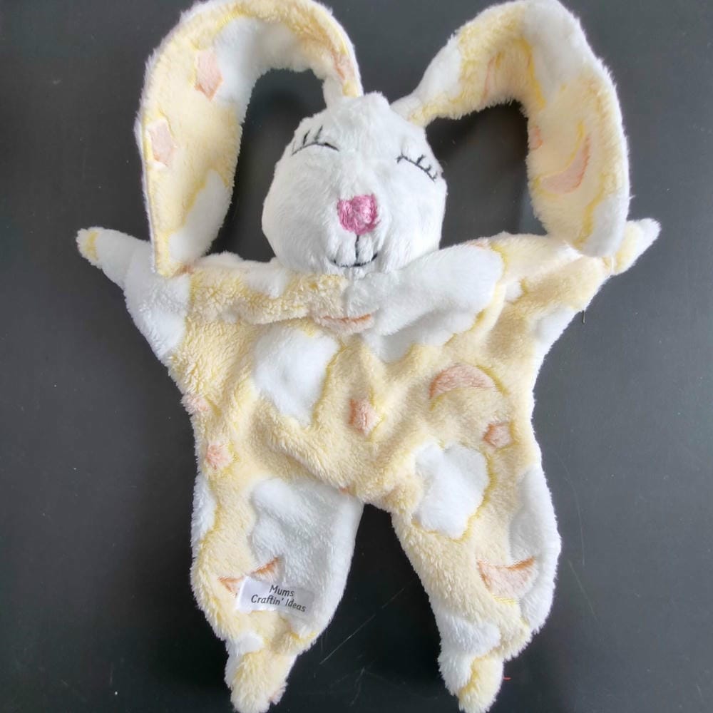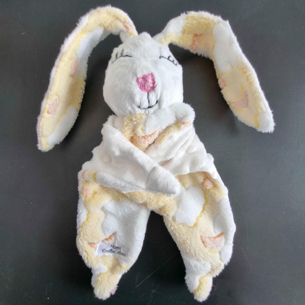 Snuggle Bunny Comforter super soft especially handmade with minky dot fabric on the back and patterned flannelette fabric on the front, along with polyester filling for the head and limbs. I have embroidered the bunnies face by hand.
