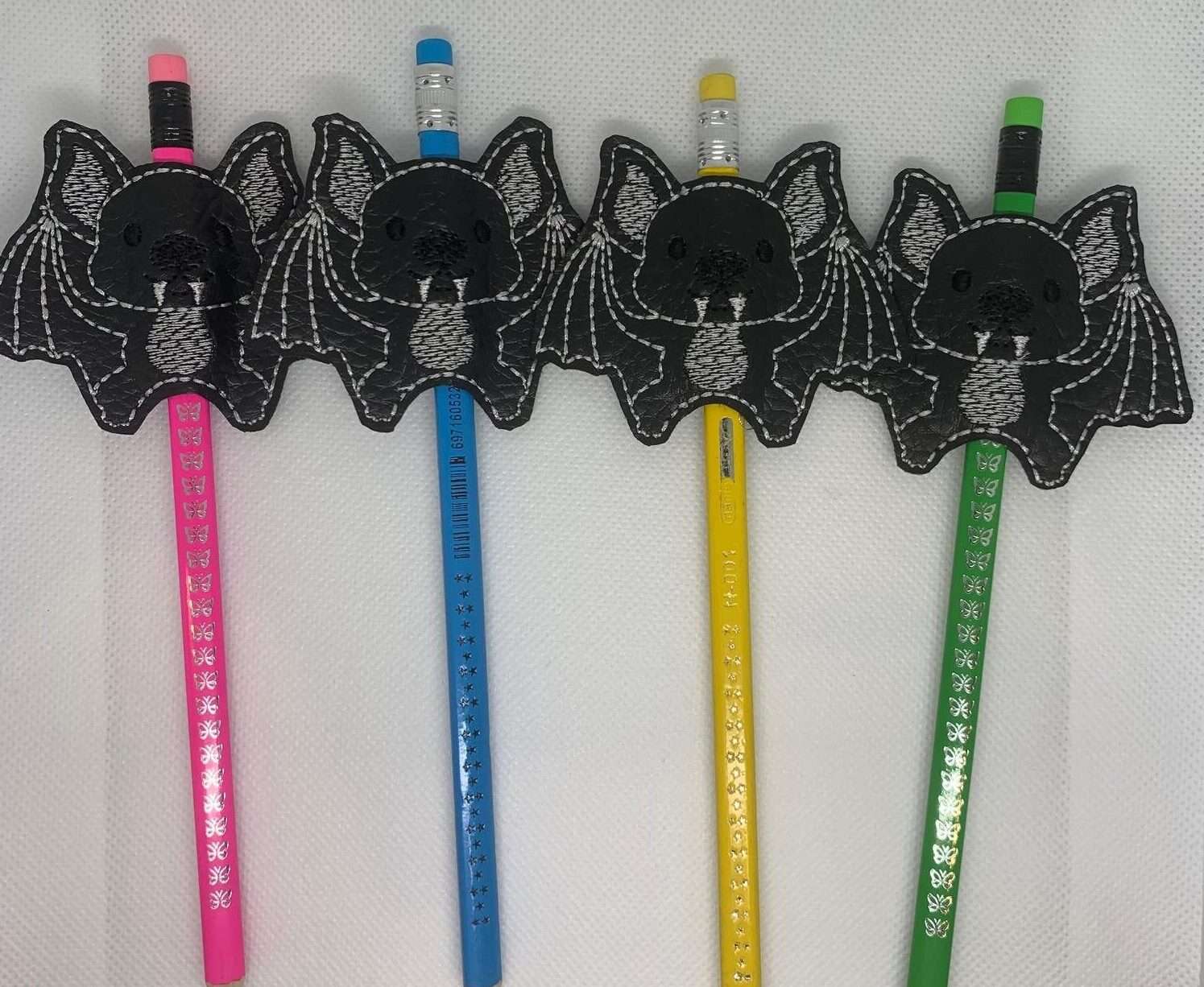 Bat pencil hugger or topper. Embroidered onto vinyl or faux leather. The pencil, pen, felt etc fits through the gaps top and bottom between the front and back of the hugger, so when the pencil has been used up, the hugger can be easily transferred to another pencil.