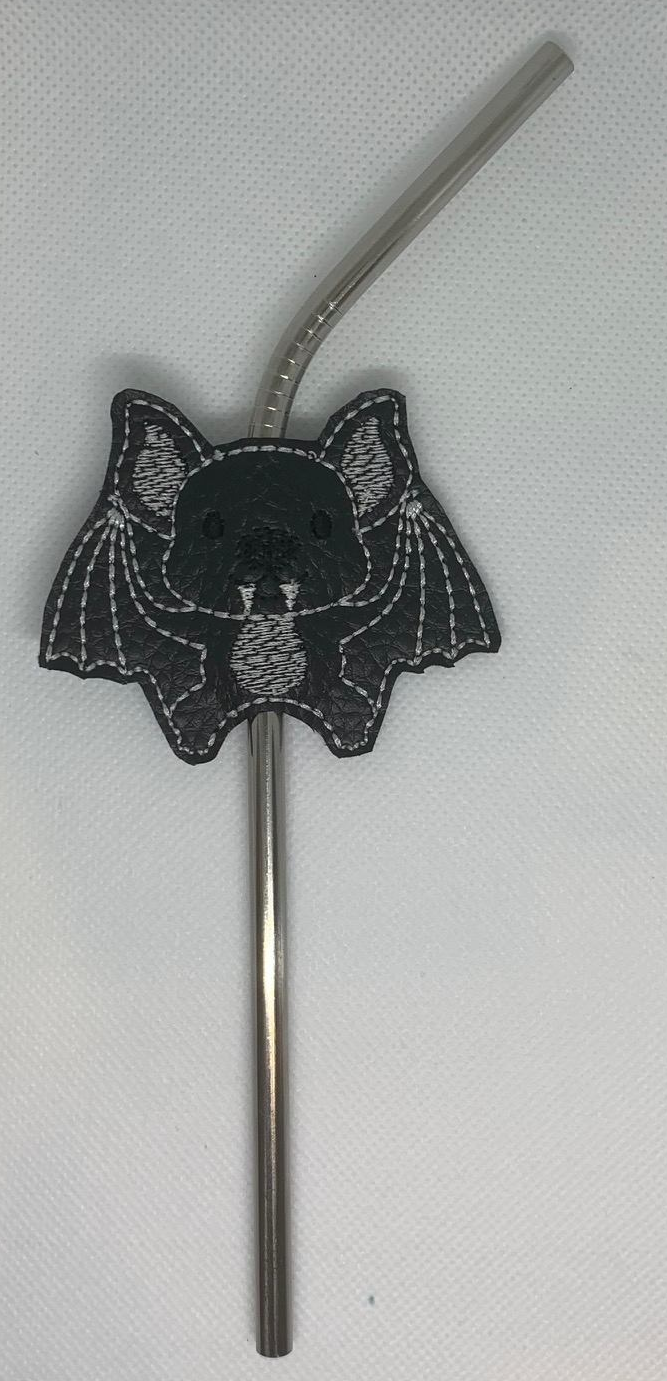 Bat straw hugger or topper. Embroidered onto vinyl or faux leather. The straw fits through the gaps top and bottom between the front and back of the hugger so once the straw has been used, the hugger can easily be removed while the straw is cleaned. Helps to ensure people know which drink is who’s and avoid cross-contamination for those with allergies.