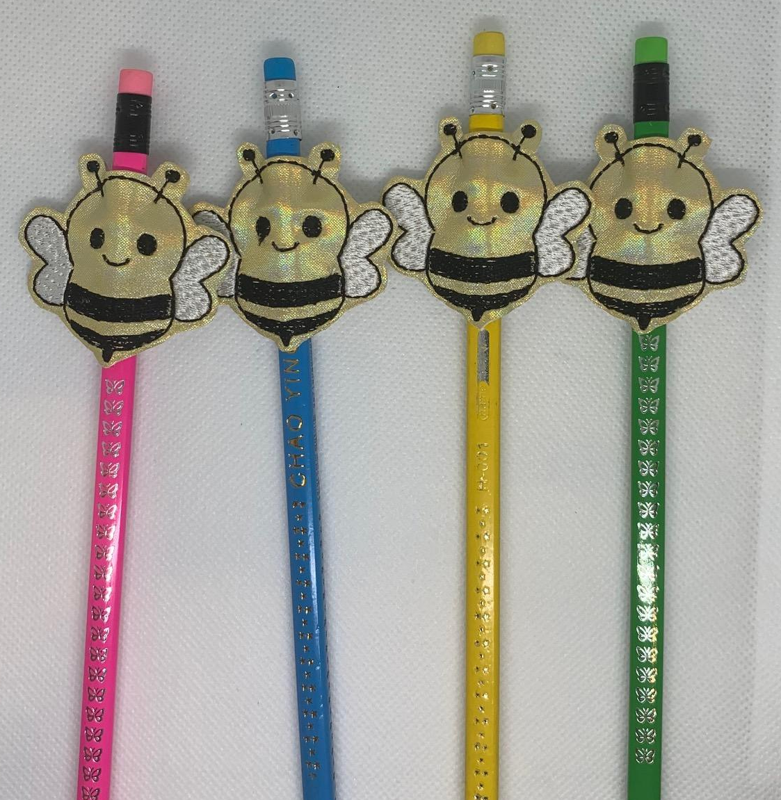 Bee pencil hugger or topper. Embroidered onto vinyl or faux leather. The pencil, pen, felt etc fits through the gaps top and bottom between the front and back of the hugger, so when the pencil has been used up, the hugger can be easily transferred to another pencil.