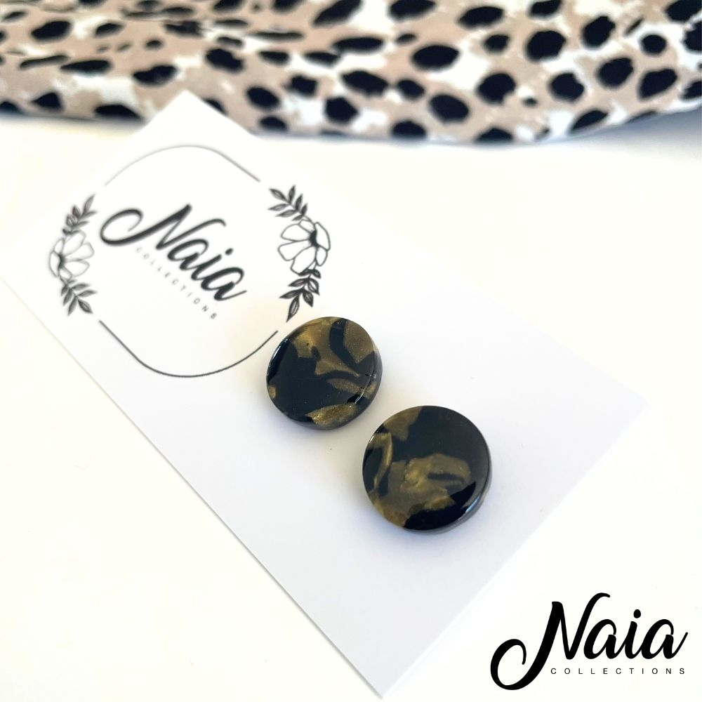 Bold and effortlessly chic, these glossy marbled studs blend deep black with swirls of gold for a luxe, one-of-a-kind finish. The colour is hand mixed by me so it is extra unique with gloss added to make the pattern pop! These earrings are hand made from high quality polymer clay which are set on surgical steel posts. Instead of using super glue the stud posts are embedded into the clay ensuring they will stand the test of time.