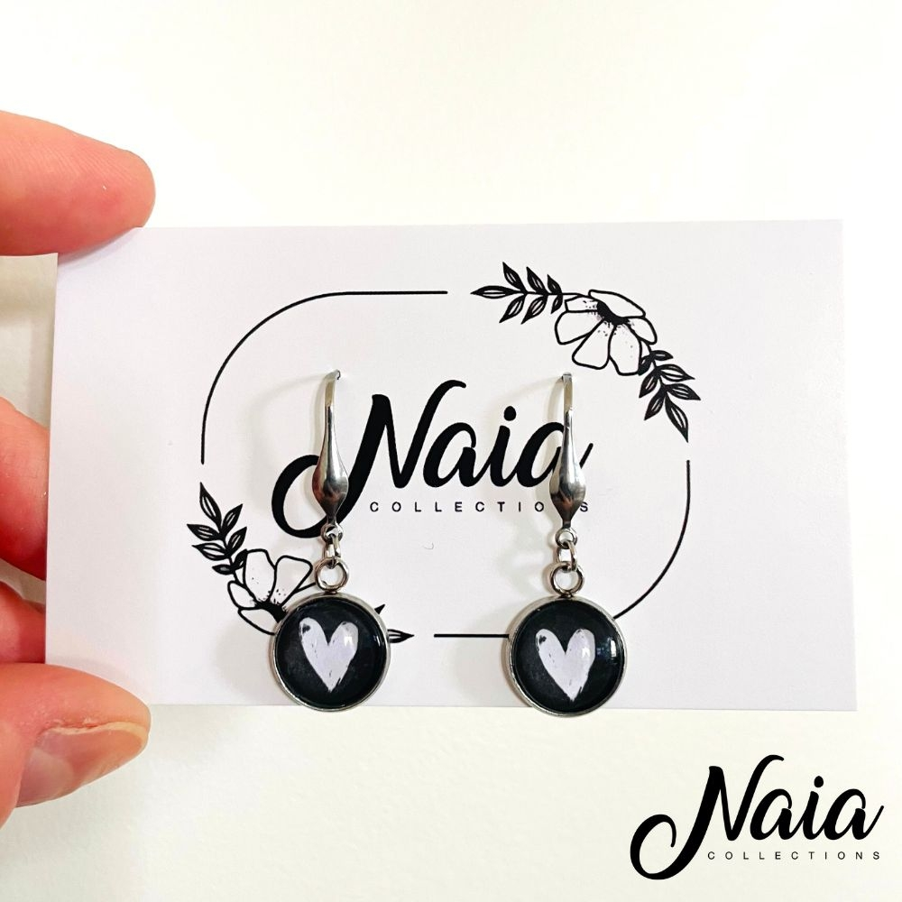 These handmade black and white dangle earrings feature a 12mm cabochan glass pendant with a glossy black background with a white heart design. Each pendant hangs from stainless steel hooks that are perfect for those with sensitive ears. These earrings offer a comfortable lightweight fit that’s ideal for everyday wear. These earrings hang approximately 2.5cm long and are handmade with love for you to enjoy.