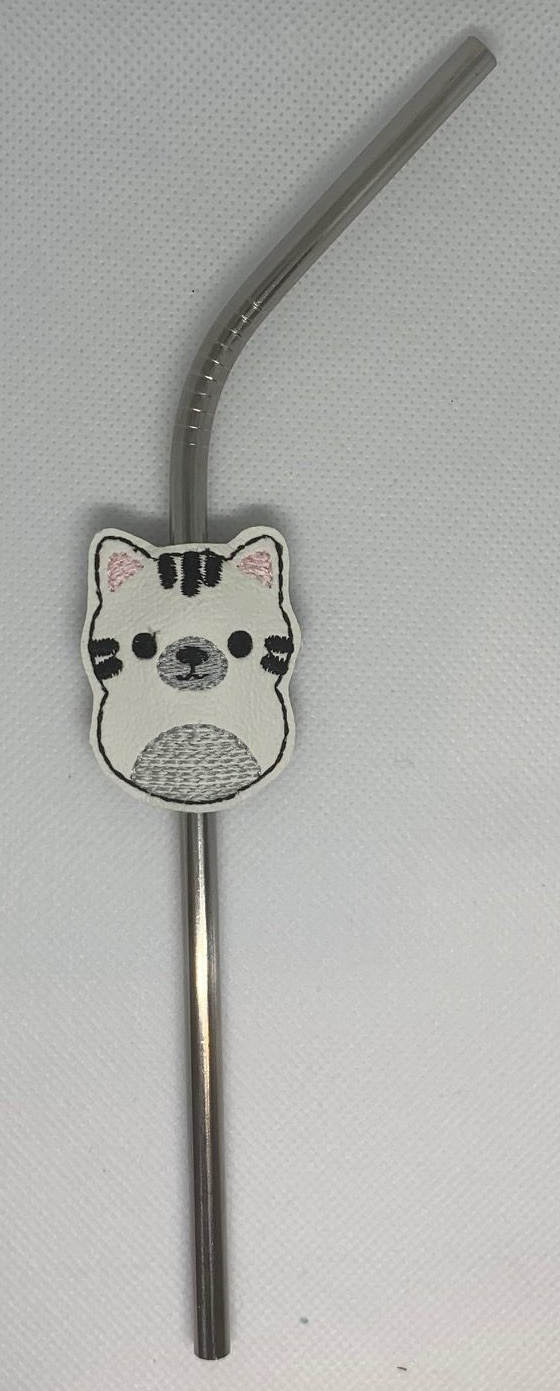 Cat straw hugger or topper. Embroidered onto vinyl or faux leather. The straw fits through the gaps top and bottom between the front and back of the hugger so once the straw has been used, the hugger can easily be removed while the straw is cleaned. Helps to ensure people know which drink is who’s and avoid cross-contamination for those with allergies.