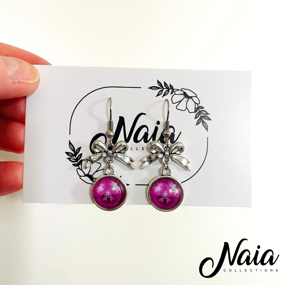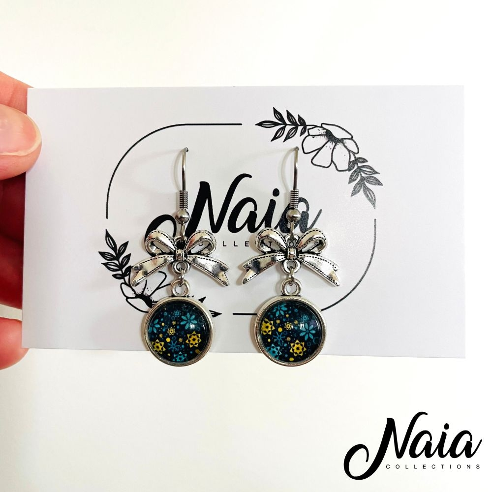 These delicate dangle add a little vintage charm with a modern twist. They feature a glass cabochan pendant in your choice of design and colour perfect for adding a pop of colour to that special outfit. Each pair is finished with a detailed silver-tone bow hanging from stainless steel hooks which are perfect those with sensitive earrings. The stainless steel hooks are durable and will not tarnish. The cabochan pendant is 1.2cm width and the whole earring has a total dangle length of 4.5 cm. These are lightweight and comfortable making them easy to wear all day.