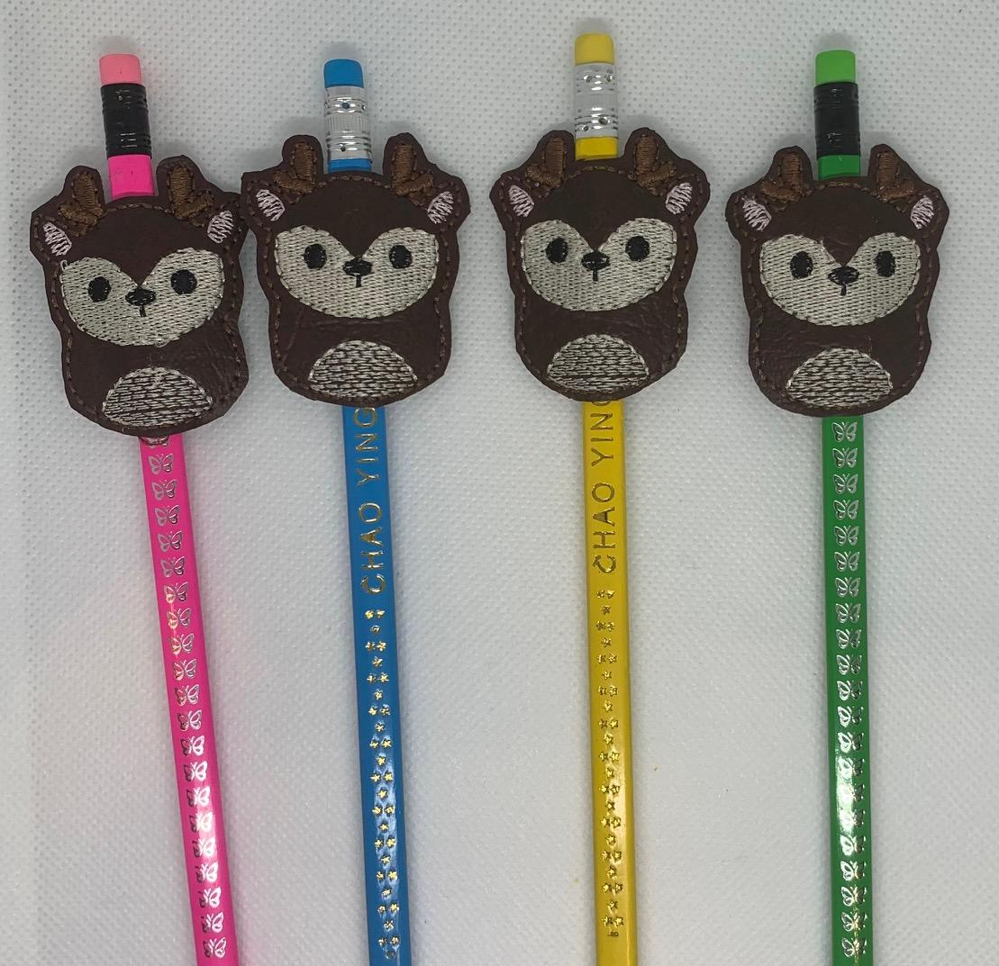 Deer pencil hugger or topper. Embroidered onto vinyl or faux leather. The pencil, pen, felt etc fits through the gaps top and bottom between the front and back of the hugger, so when the pencil has been used up, the hugger can be easily transferred to another pencil.