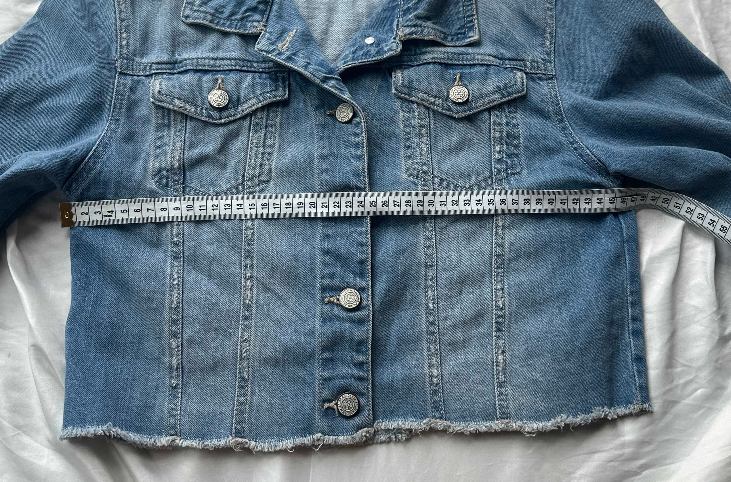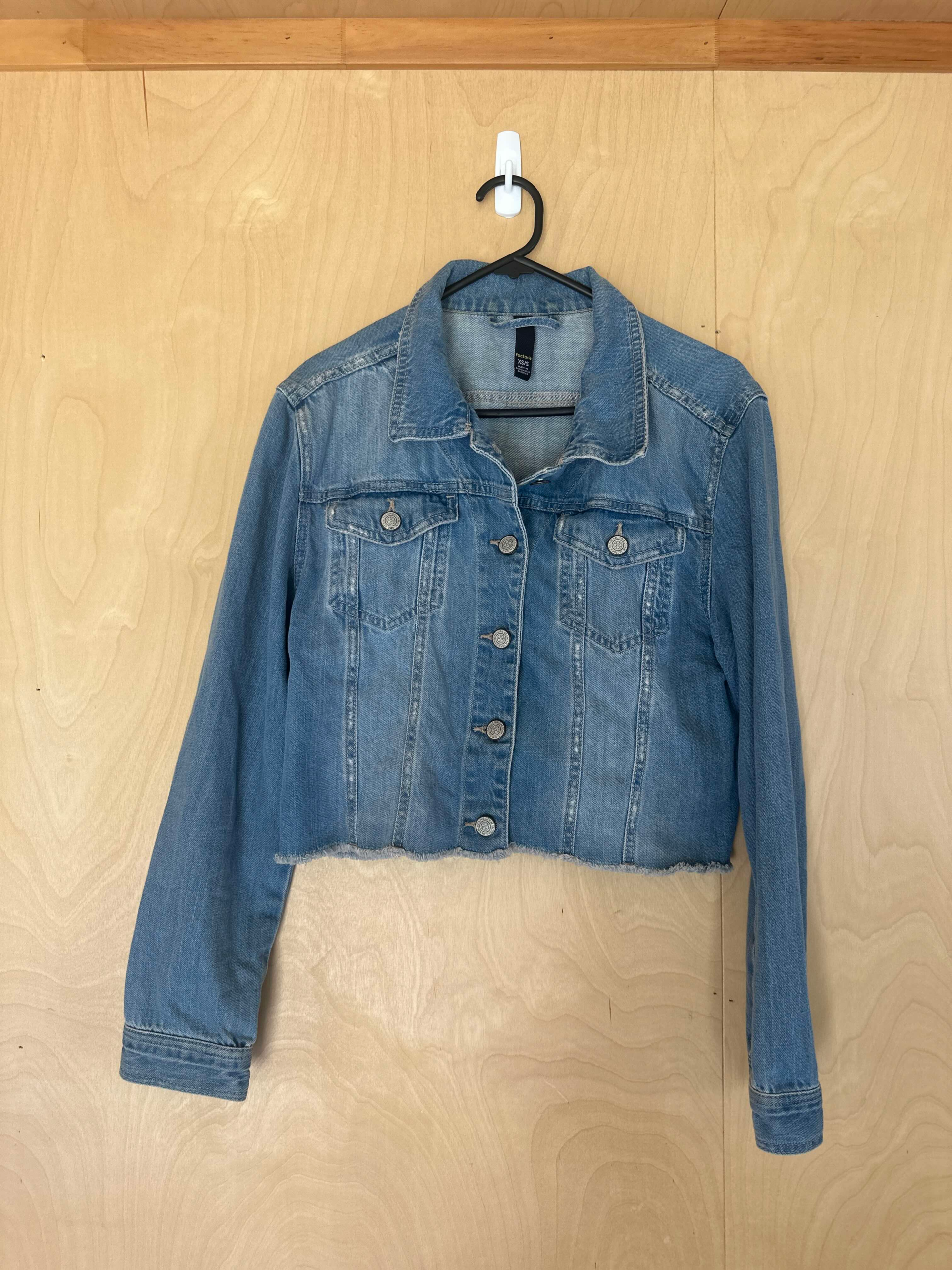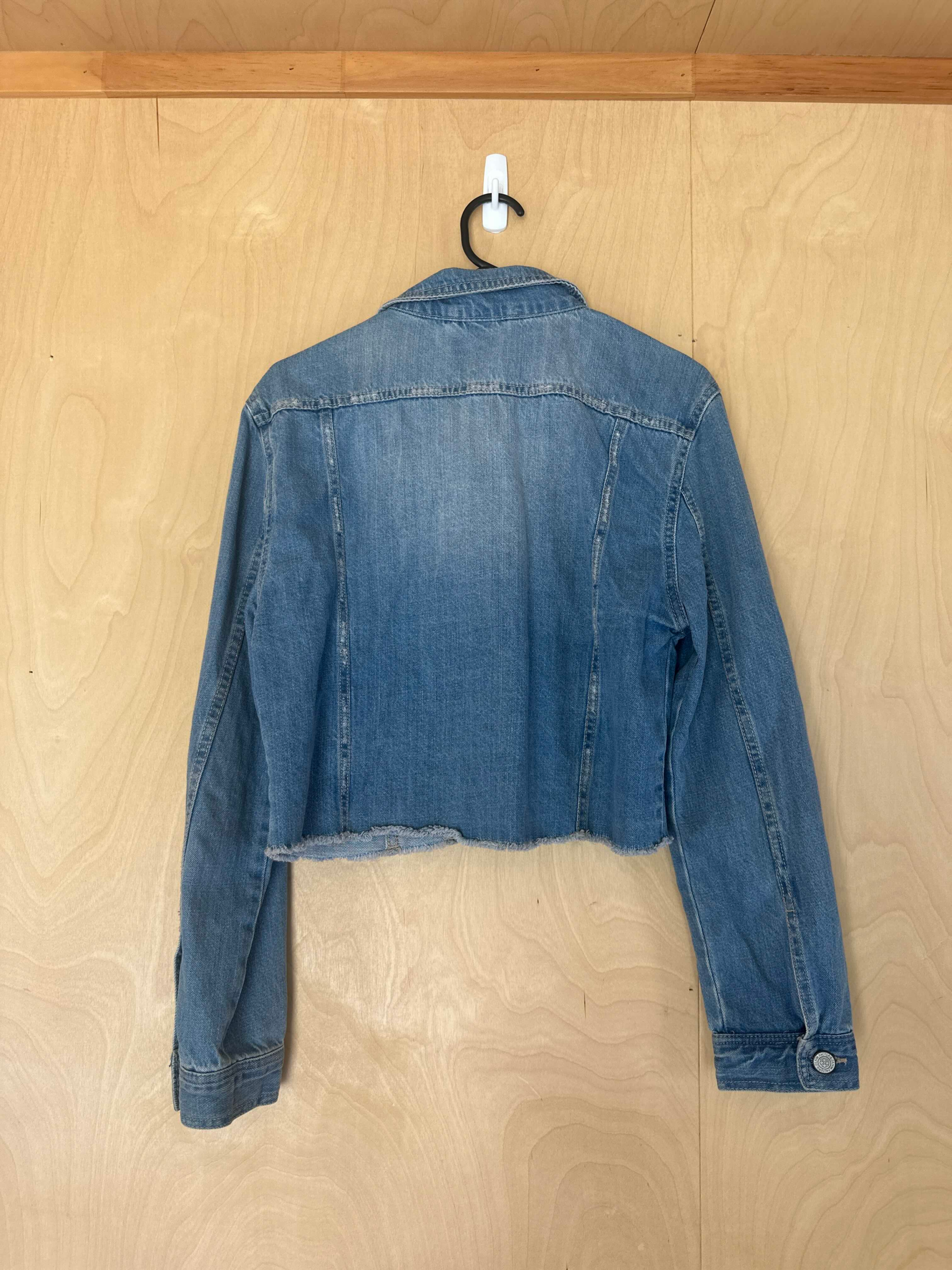 This is a gently used women’s cropped denim jacket, presented in excellent condition and featuring a stylish design.