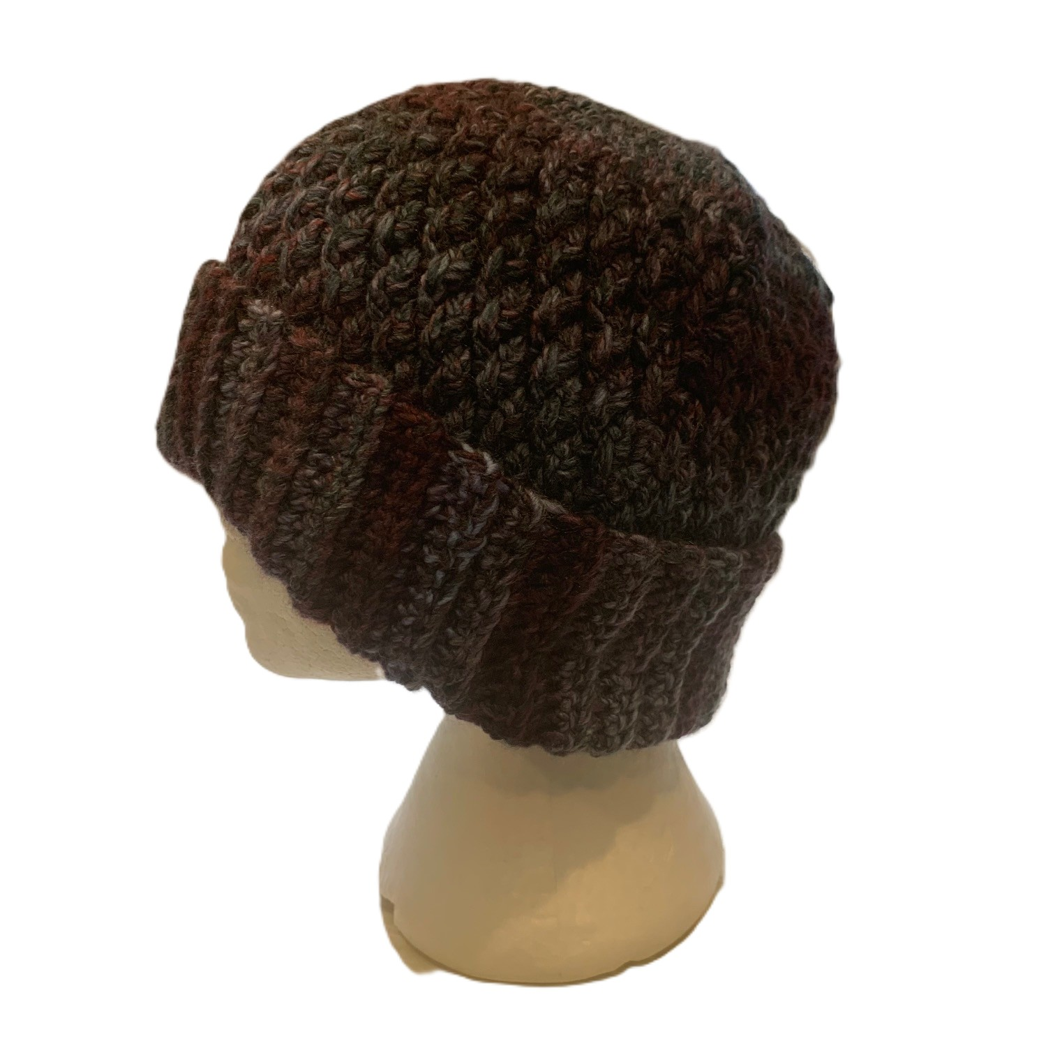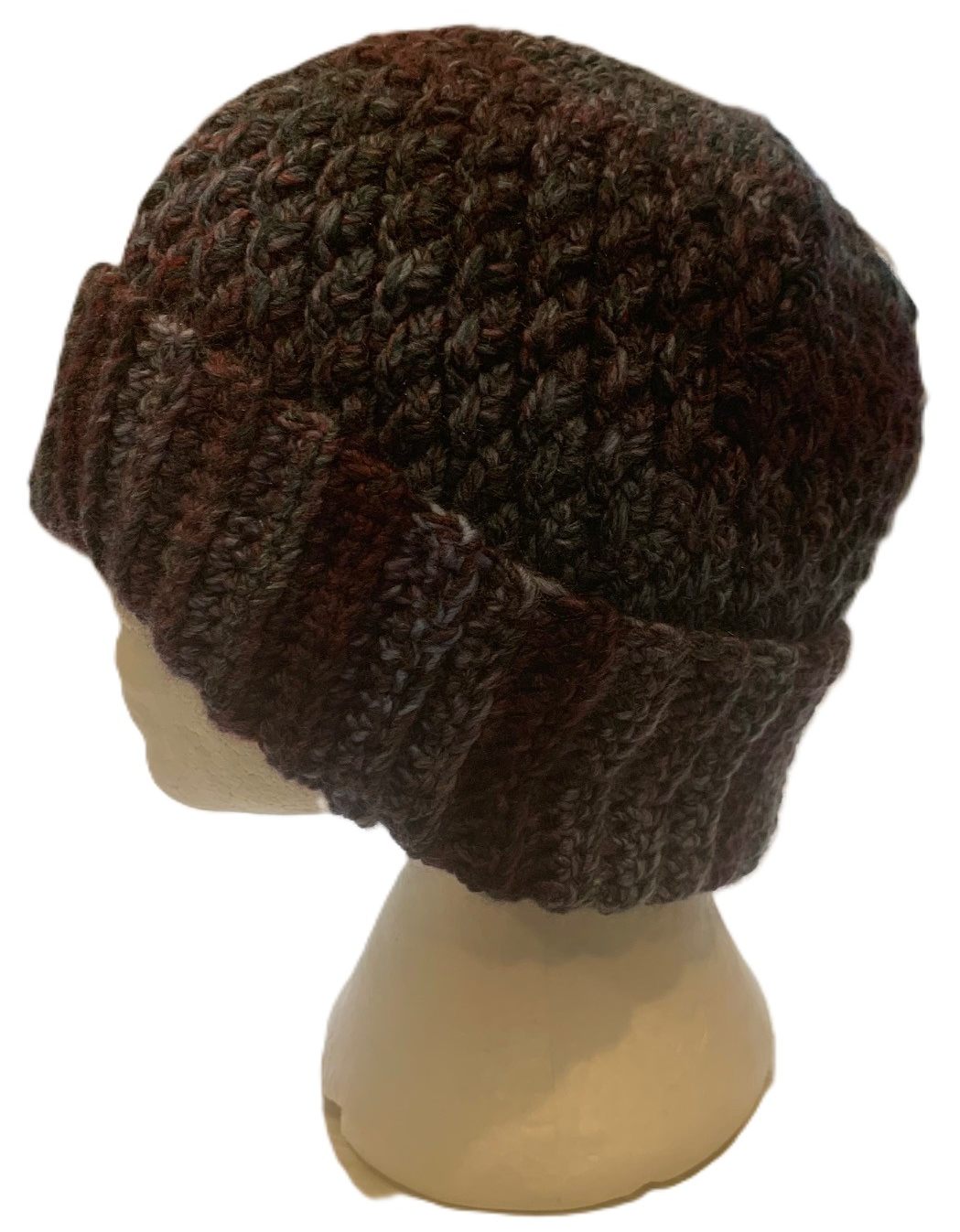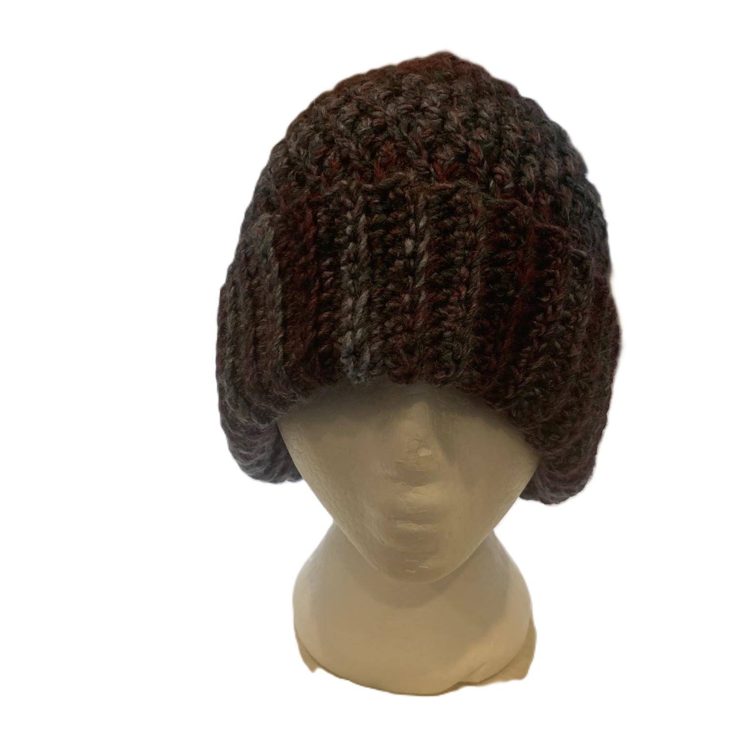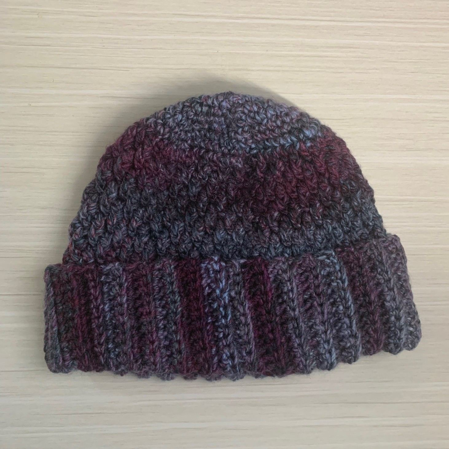 Hand crochet folded brim beanie, made in a gorgeous, soft burgundy and grey yarn. Measures approximately 20cm high (brim up) x 50cm circumference. Fits an average adult or tween/teen head.