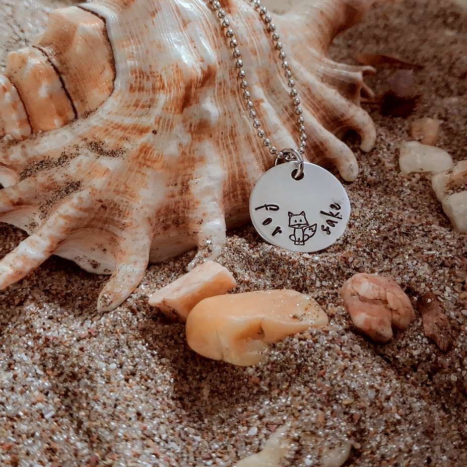 The For (FOX) Sake Pendant is handstamped for you on a 22mm aluminium disc. It comes on a 60cm stainless steel ball chain, ready to wear.