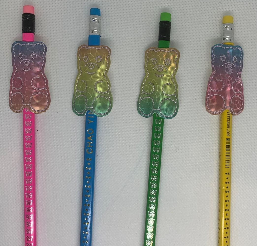 Gummy Bear pencil hugger or topper. Embroidered onto vinyl or faux leather. The pencil, pen, felt etc fits through the gaps top and bottom between the front and back of the hugger, so when the pencil has been used up, the hugger can be easily transferred to another pencil.