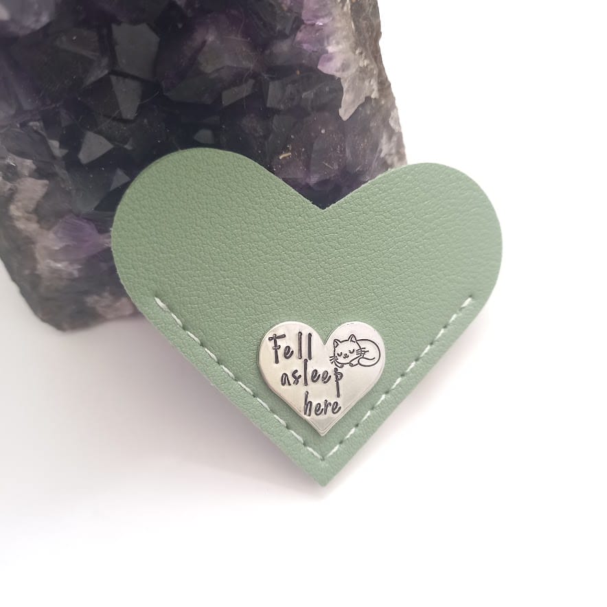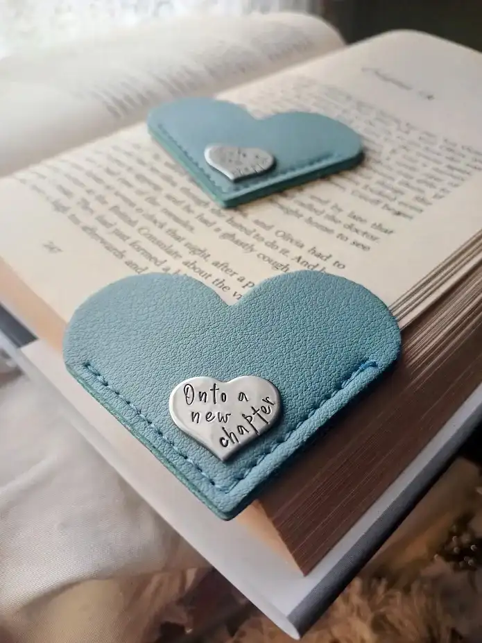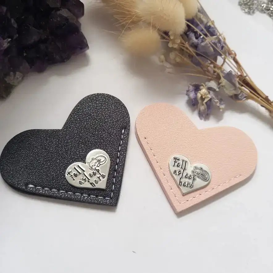 This gorgeous heart shaped bookmark is finished off with a cute metal heart that is handstamped with words of your choice.