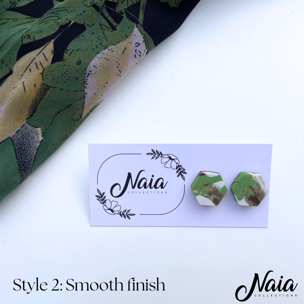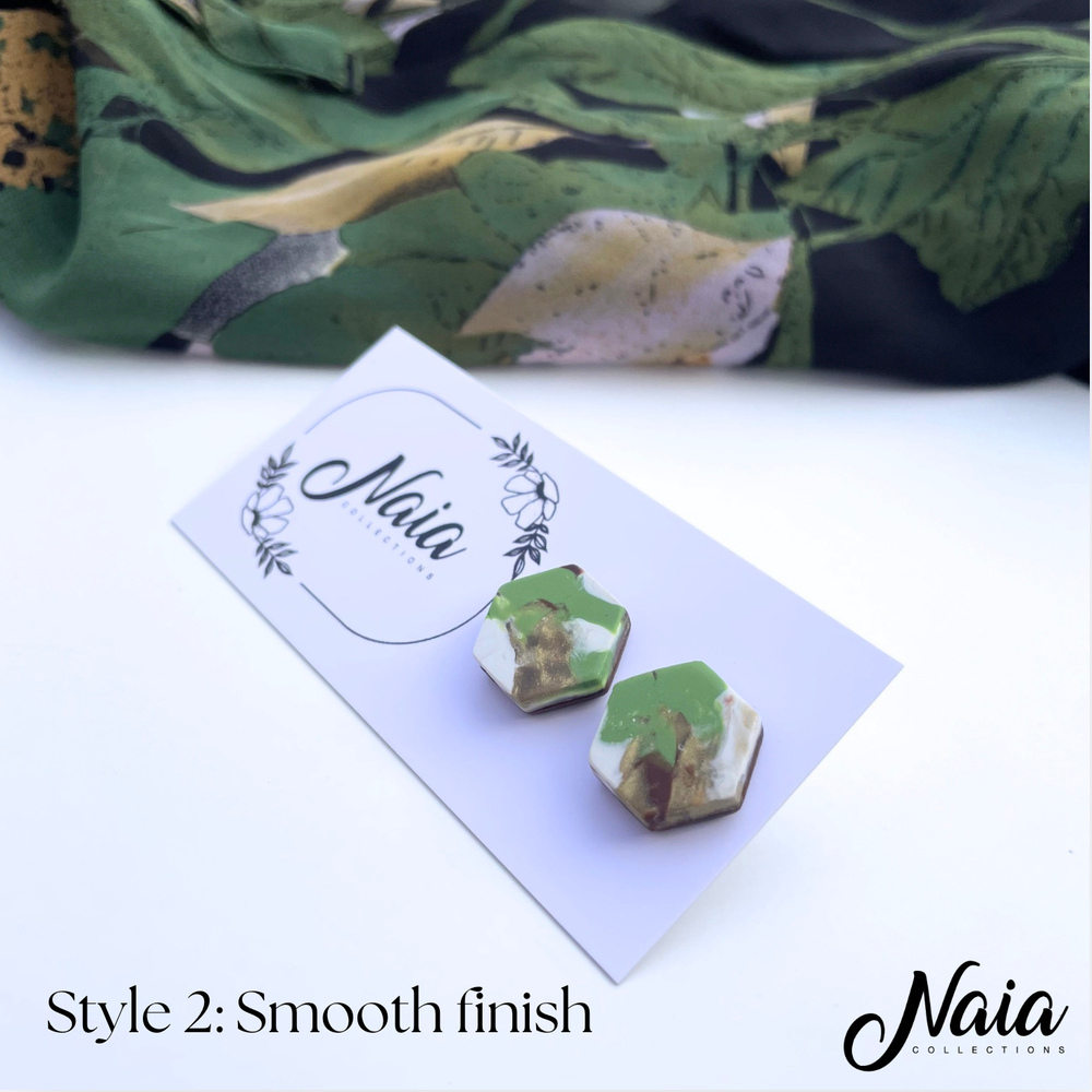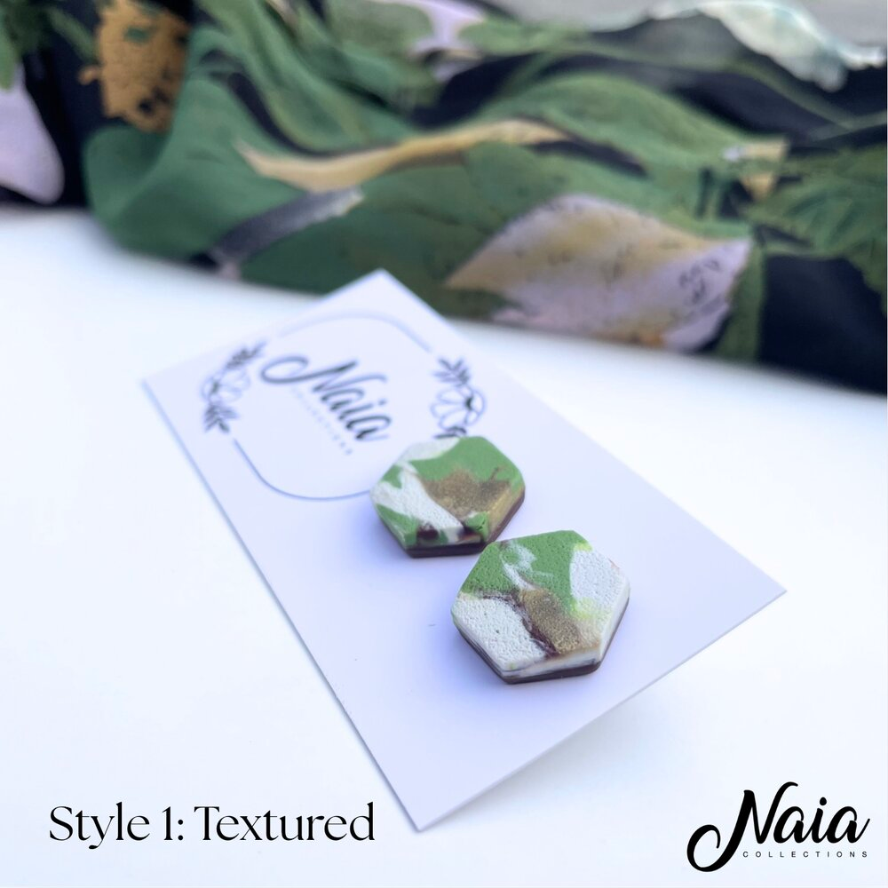 These hexagon studs are one of many from our Autumn Collection, hand made from high quality polymer clay which are set on surgical steel posts. The colour is hand mixed by me so this design is unique and will make you stand out from the crowd. Use the options provided to select the finish you would like, choose between textured or smooth (see the photos for each option) . Instead of using super glue the stud posts are embedded into the clay ensuring they will stand the test of time.