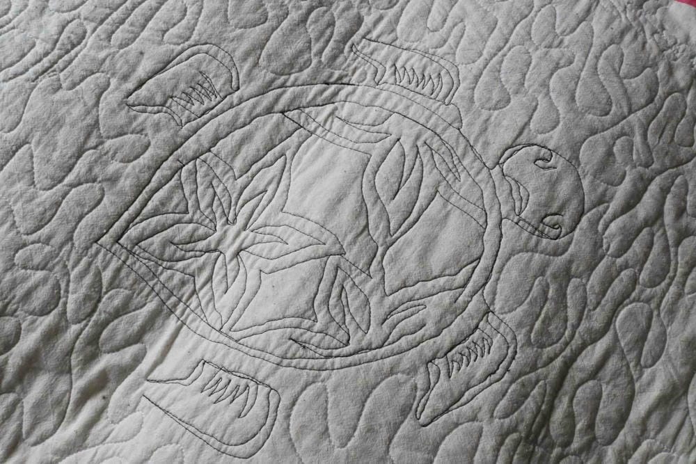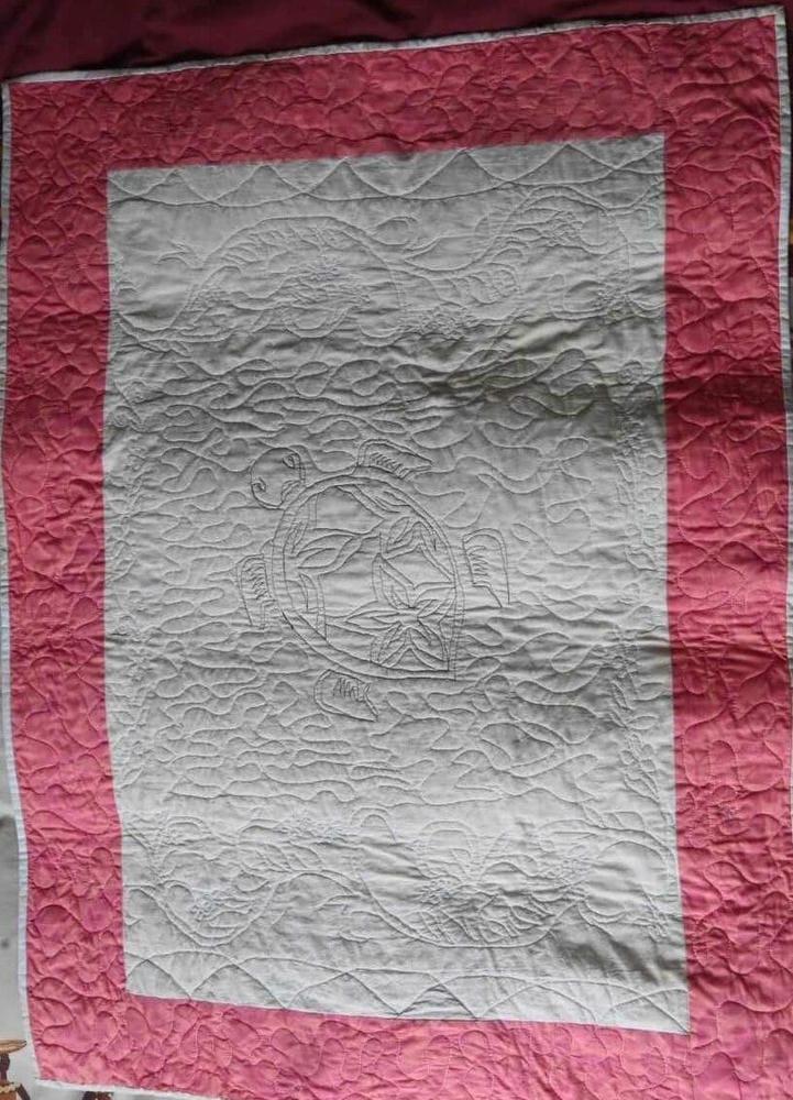 Unique quilted design of a Turtle with Island Flower Borders.