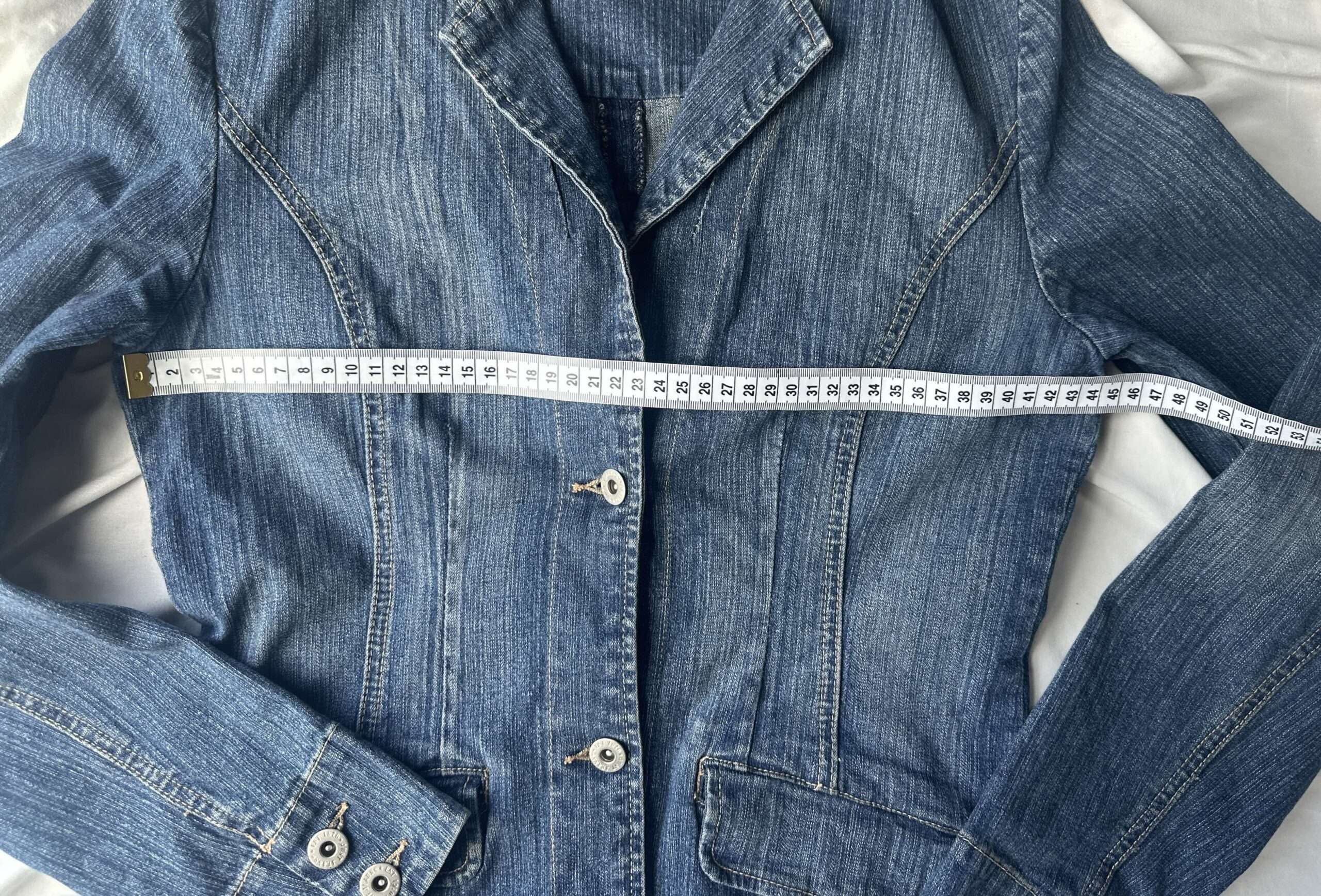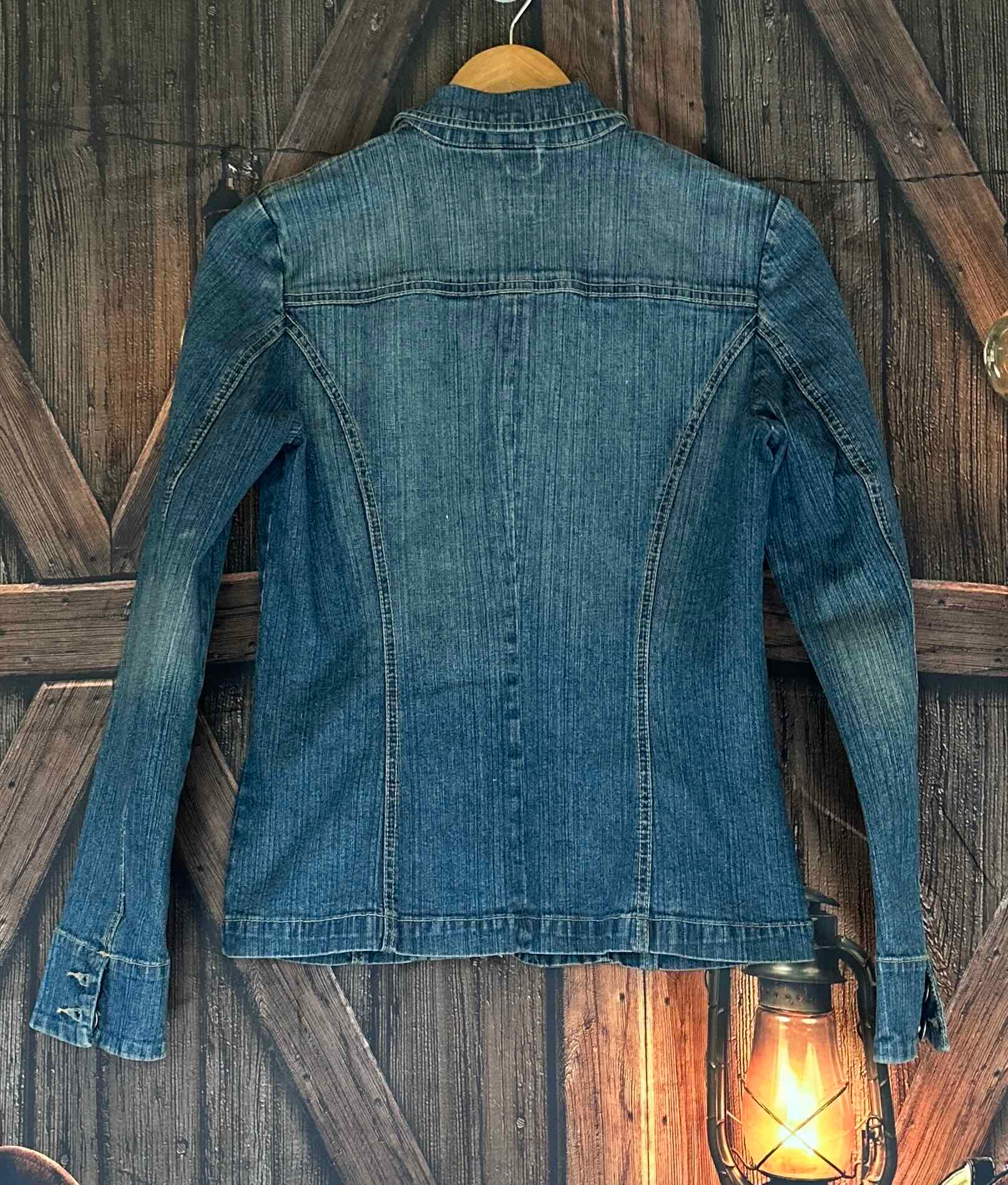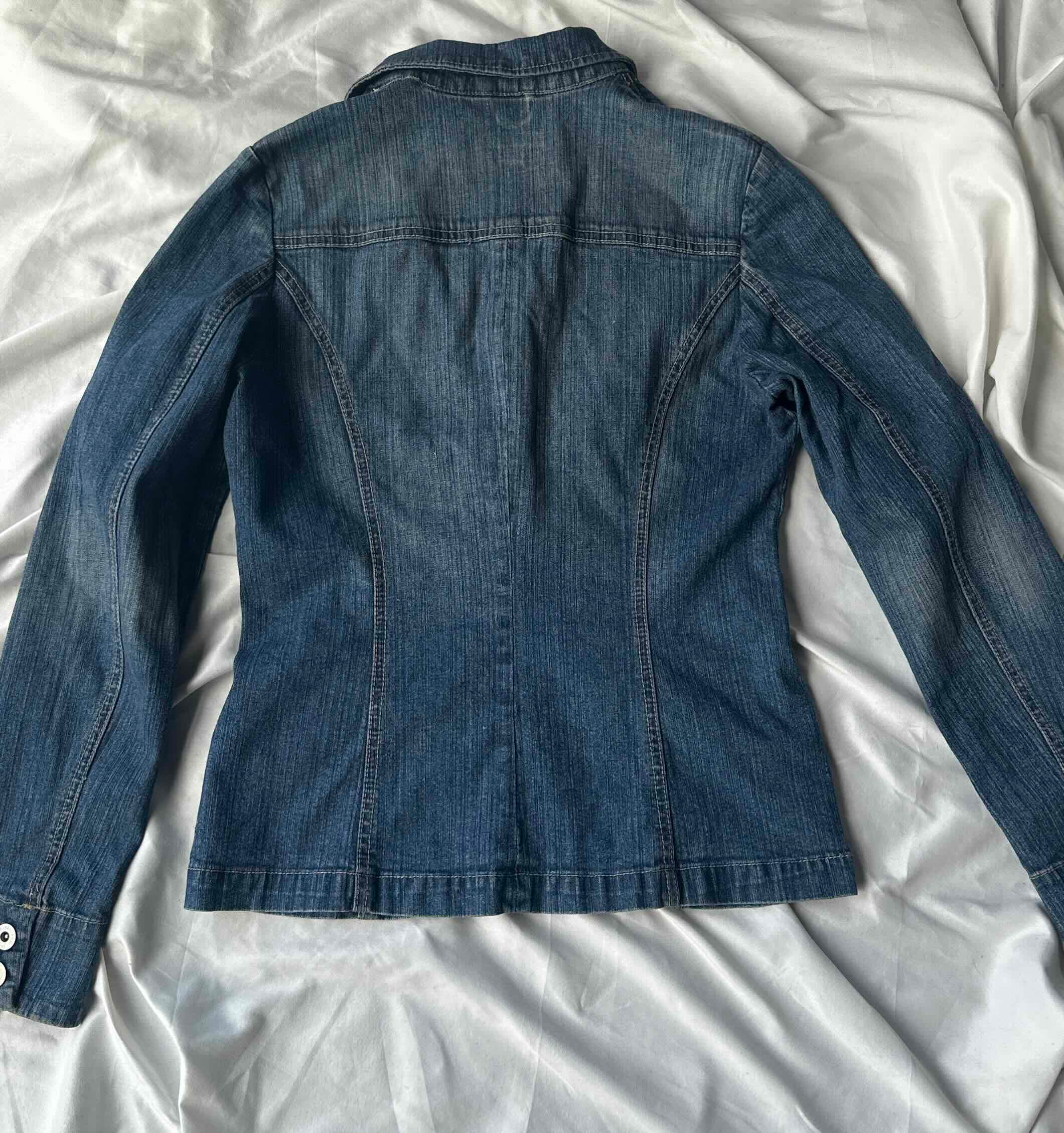 This preloved fitted denim jacket features a stylish design and includes a slight stretch for added comfort.