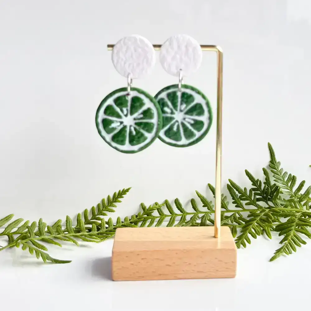 Lime slices measure approx 25-30mm (handcut so vary) and hang from a dimpled earring stud.  Super lightweight you wont even remember you’re wearing them.