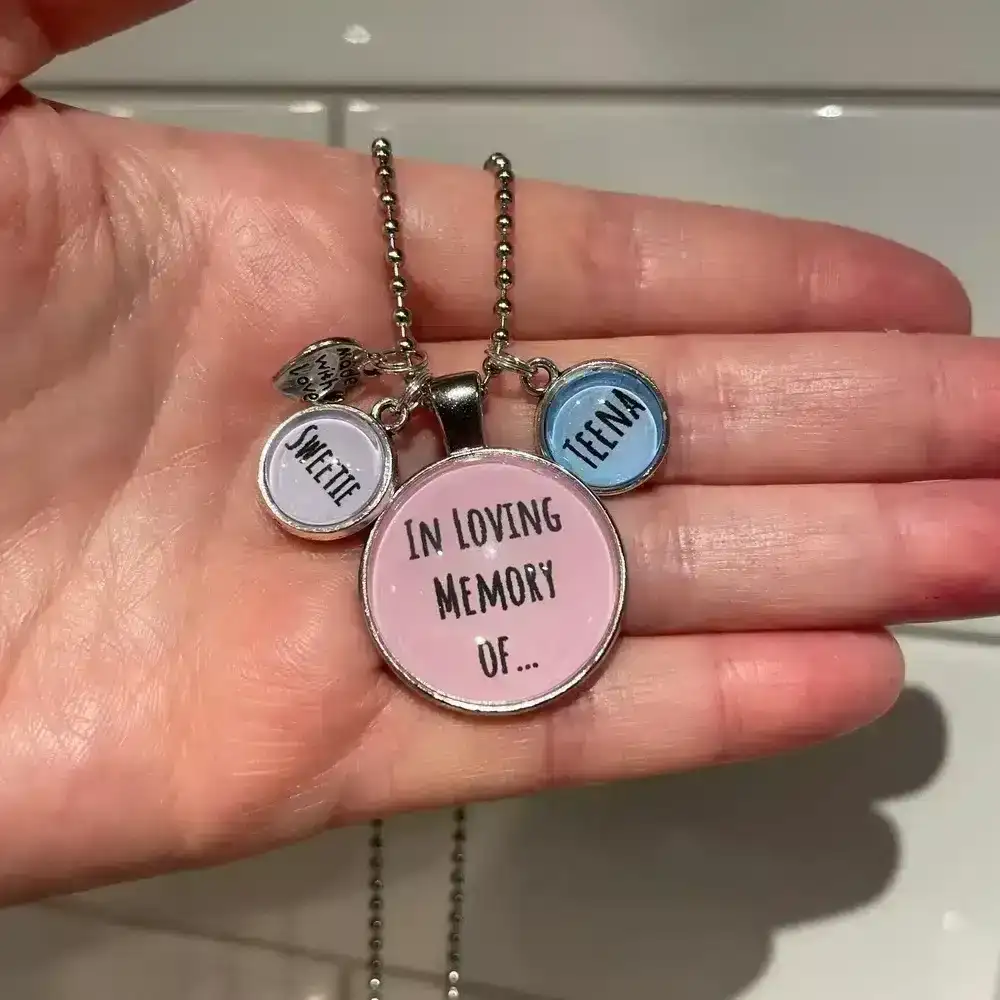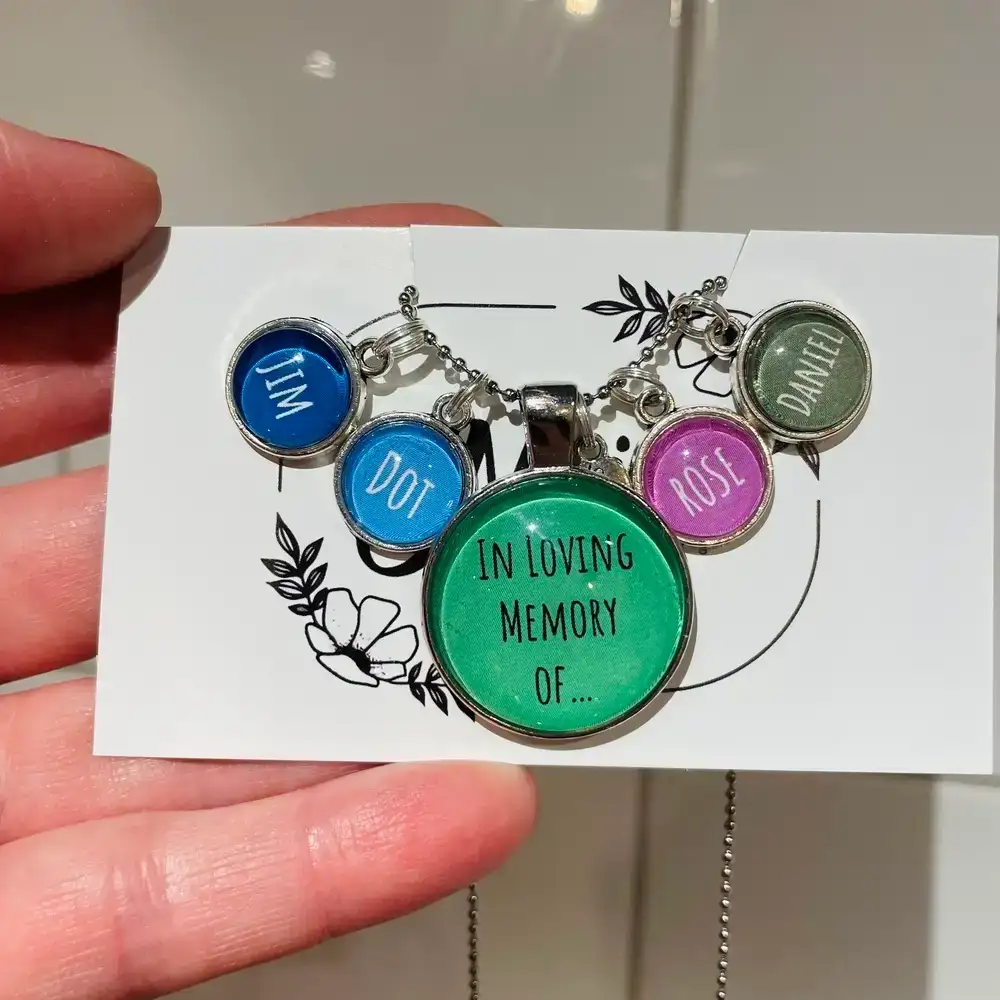 Keep the memory of your loved ones close to your heart with this beautiful photo necklace. These are handmade with love with the main glass cabochon that is 25mm in diameter and the small name pendants that are 1.2cm. This pendant hangs from a silver plated 70cm ball and link chain which sits around chest height.