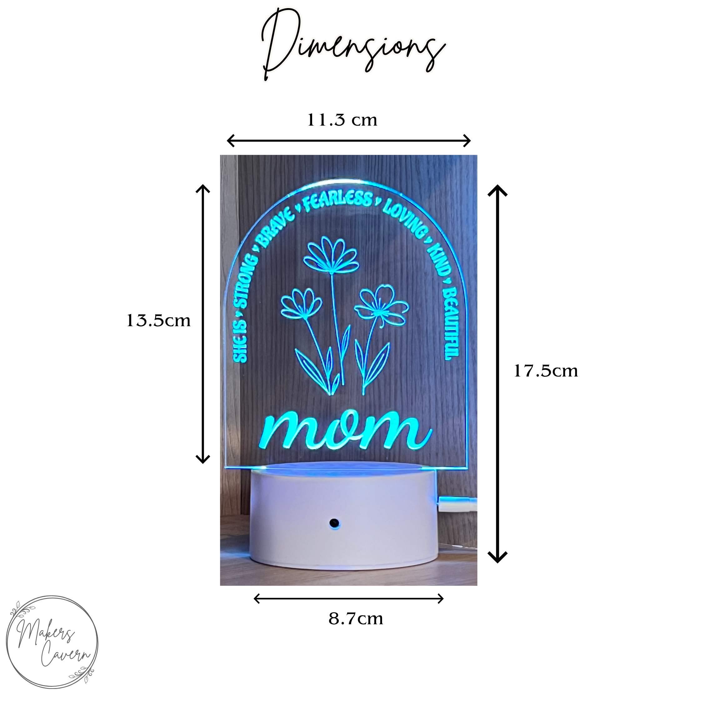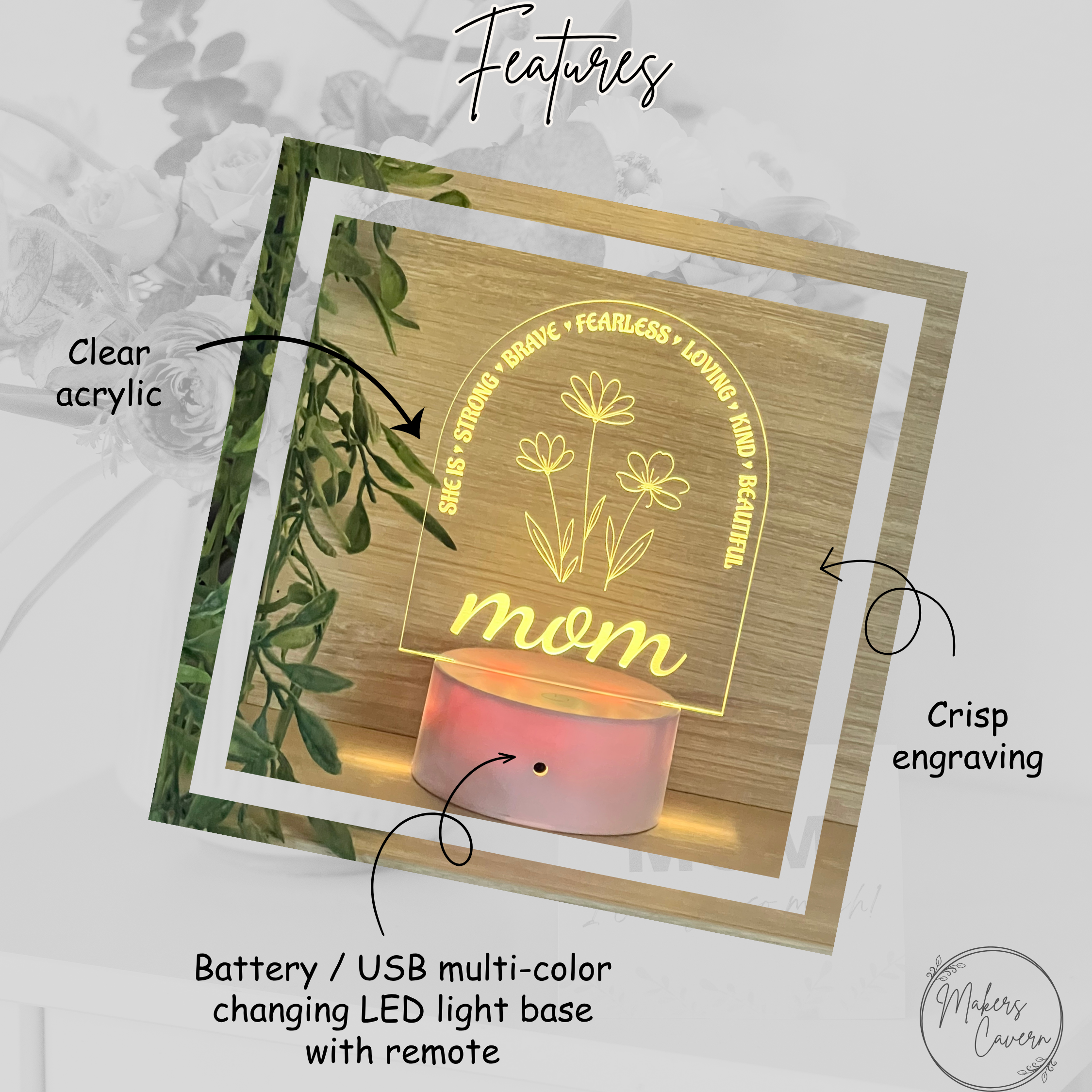 Crafted from crystal-clear acrylic and delicately engraved with blooming florals and heartfelt affirmation words, this LED nightlight is more than a gift—it’s a quiet, glowing reminder of how deeply she’s loved.