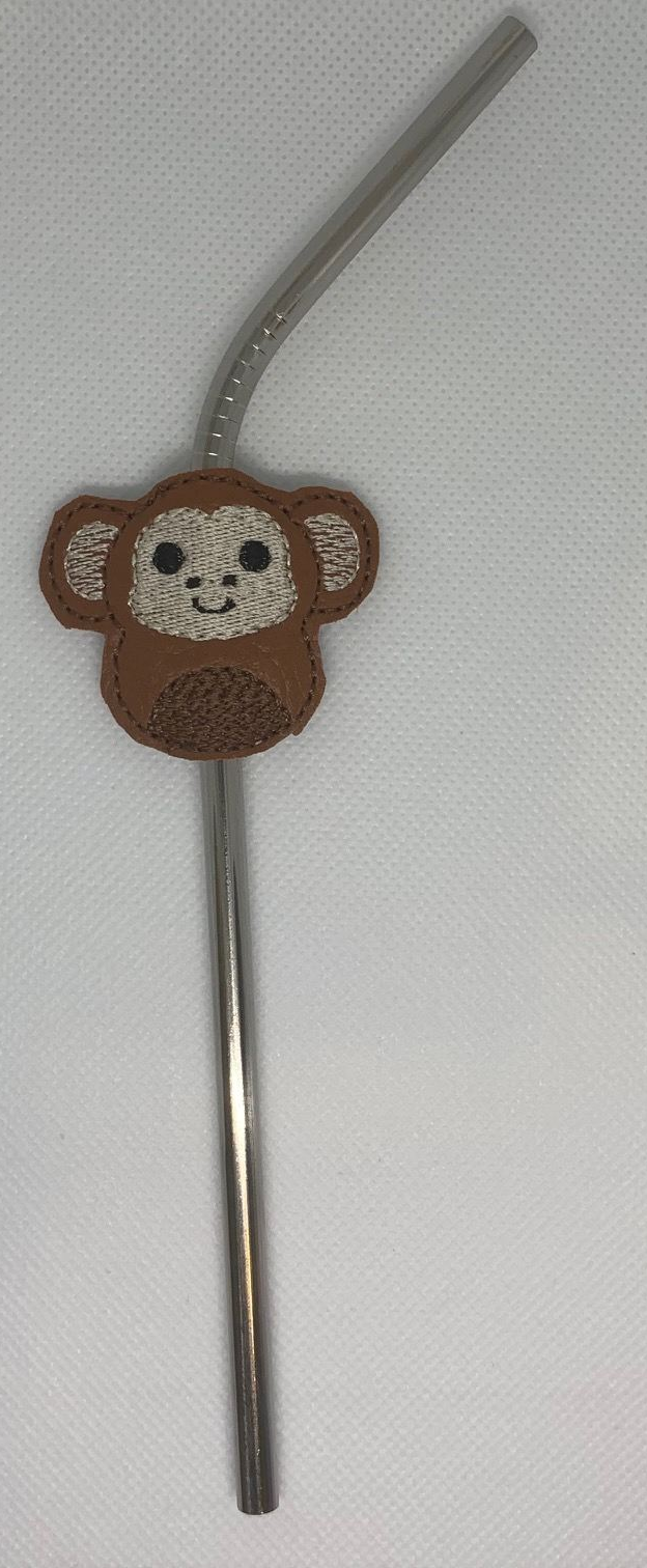 Monkey straw hugger or topper. Embroidered onto vinyl or faux leather. The straw fits through the gaps top and bottom between the front and back of the hugger so once the straw has been used, the hugger can easily be removed while the straw is cleaned. Helps to ensure people know which drink is who’s and avoid cross-contamination for those with allergies.
