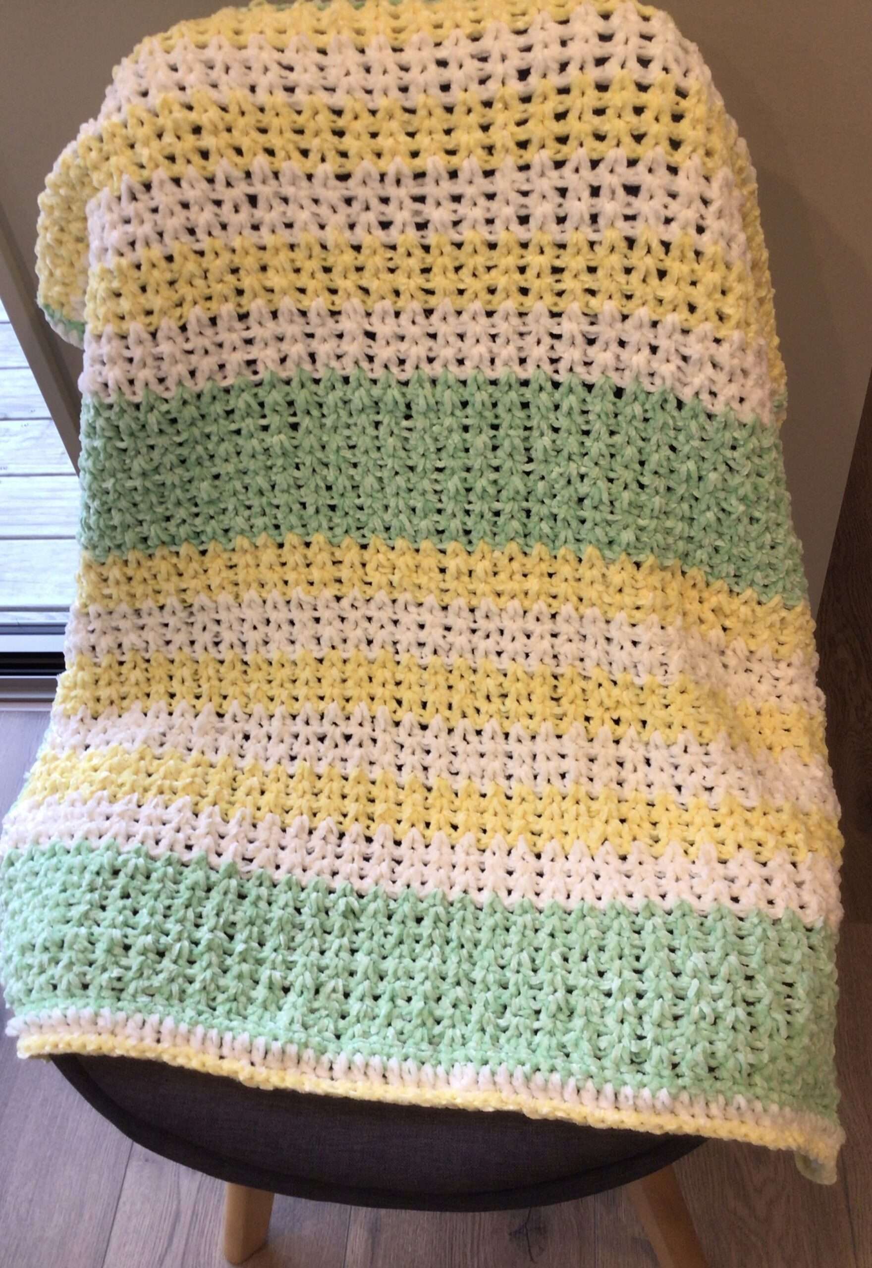 I crocheted this incredibly soft nursery blanket using pastel green, white, and yellow chenille yarn.