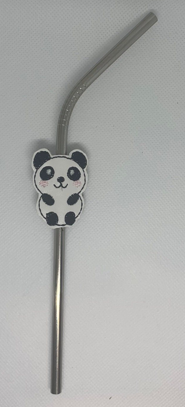 Panda straw hugger or topper. Embroidered onto vinyl or faux leather. The straw fits through the gaps top and bottom between the front and back of the hugger so once the straw has been used, the hugger can easily be removed while the straw is cleaned. Helps to ensure people know which drink is who’s and avoid cross-contamination for those with allergies.