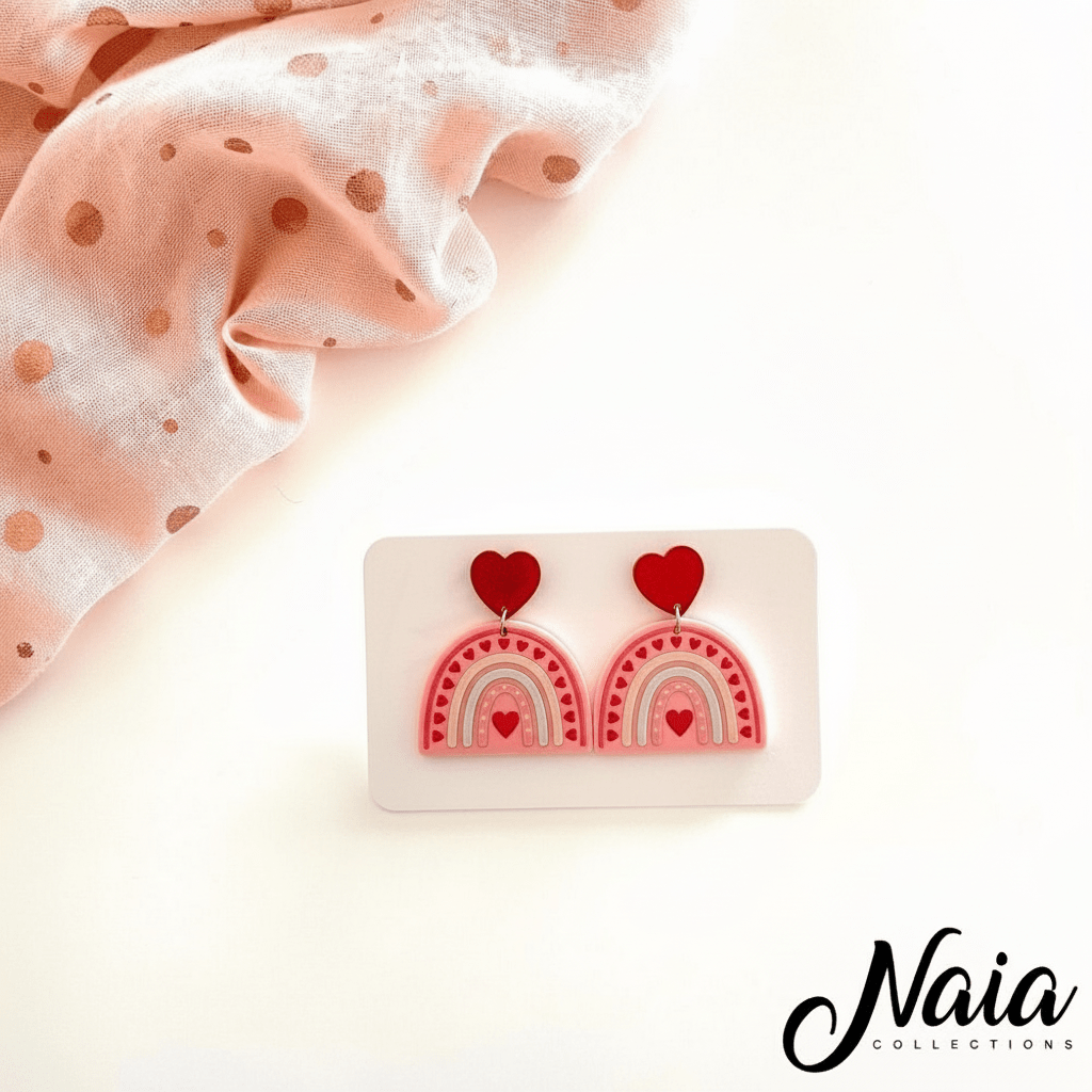 These super cute earrings are lightweight and so easy to wear you will forget you are wearing them! These dangle earrings consists of a red acrylic stud top that sparkles and measures approx 1.4cm by 1.4cm. The stud top has a stainless steel post so they are perfect for those with sensitive ears. Hanging from the stud is a rainbow shape pendant that has a mixture of red, white and pink UV printed onto a light pink acrylic. This pendant is approx 2.6cm high by 3.4cm wide with a total dangle length of 3.9cm.