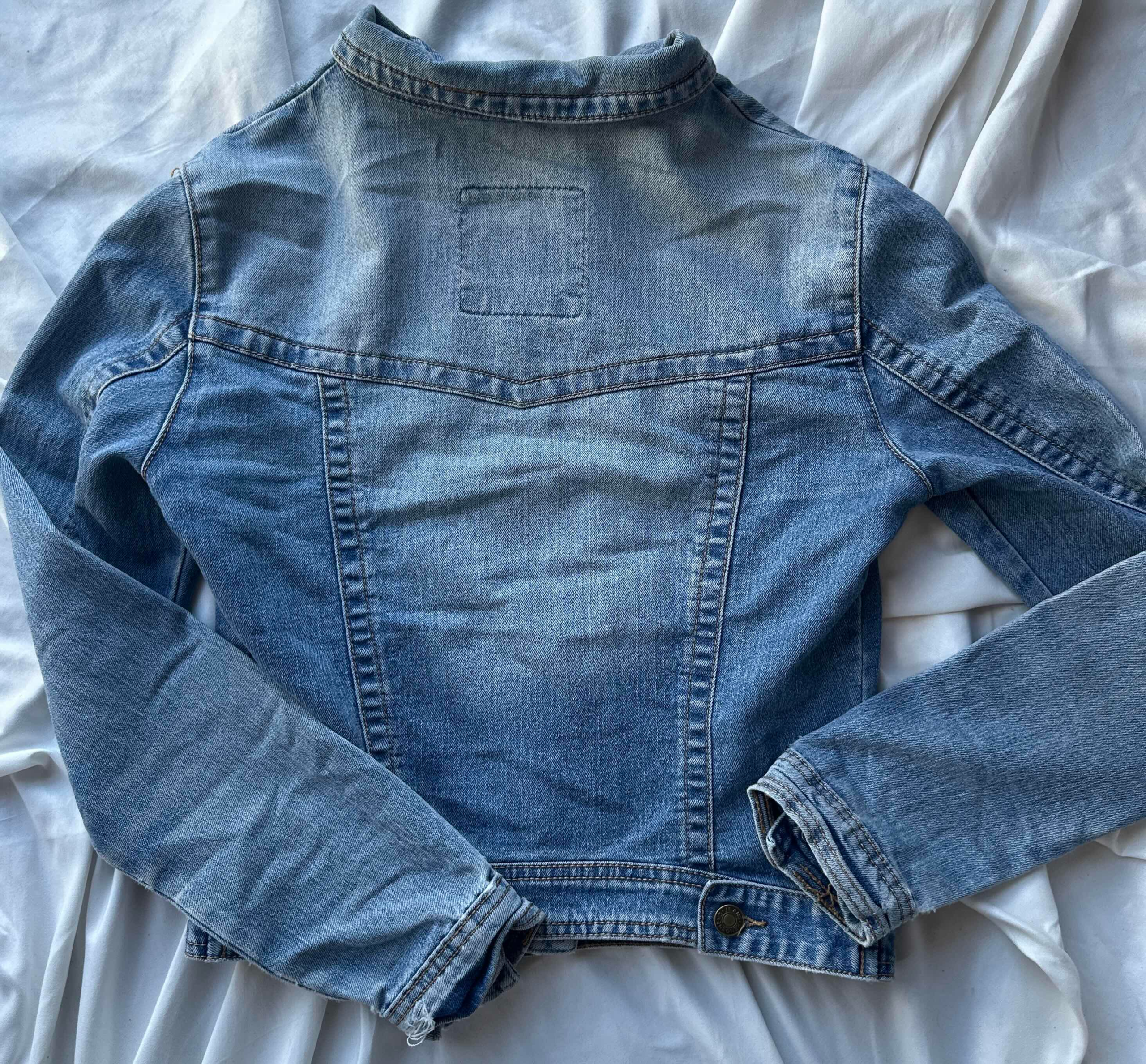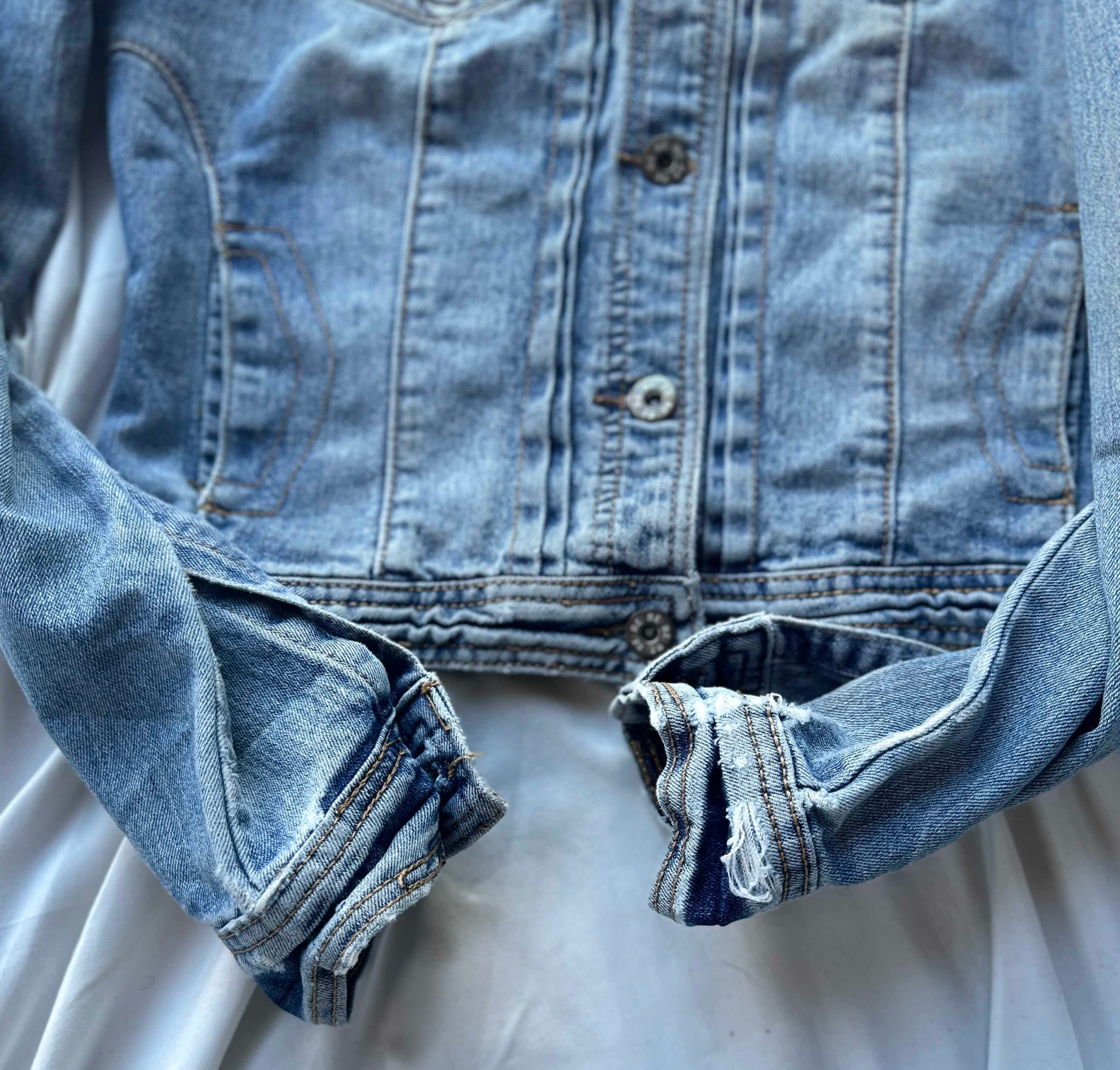 This is a gently used women’s denim jacket featuring stylish distressed cuffs.