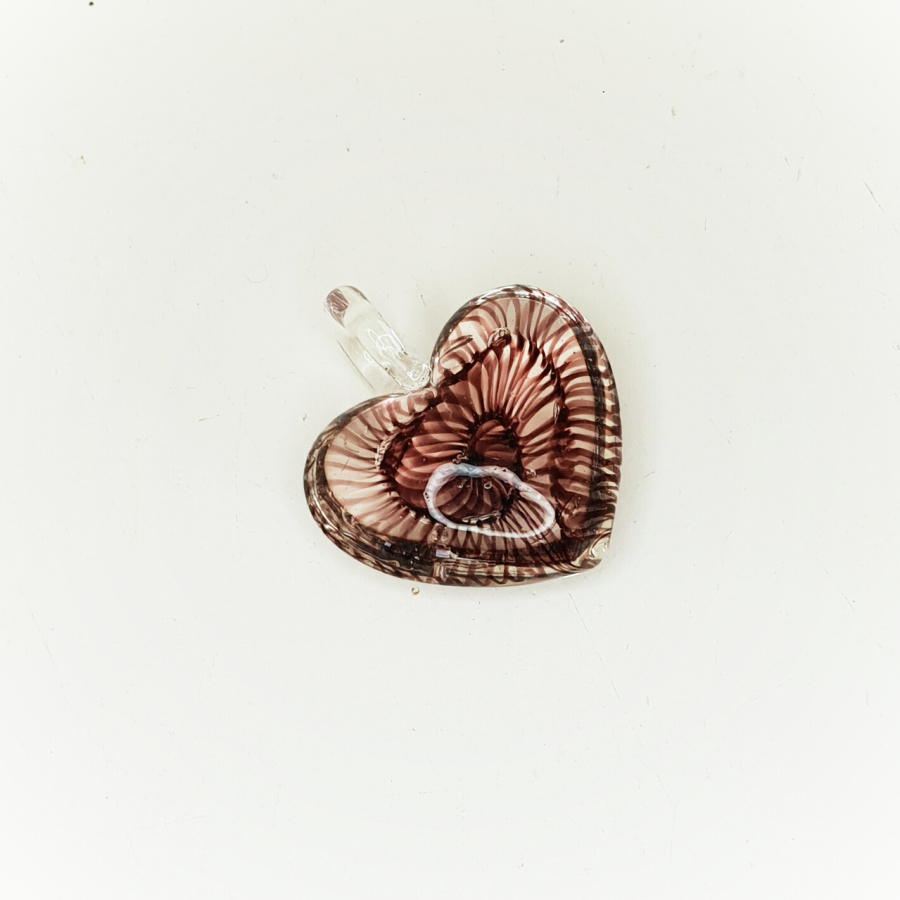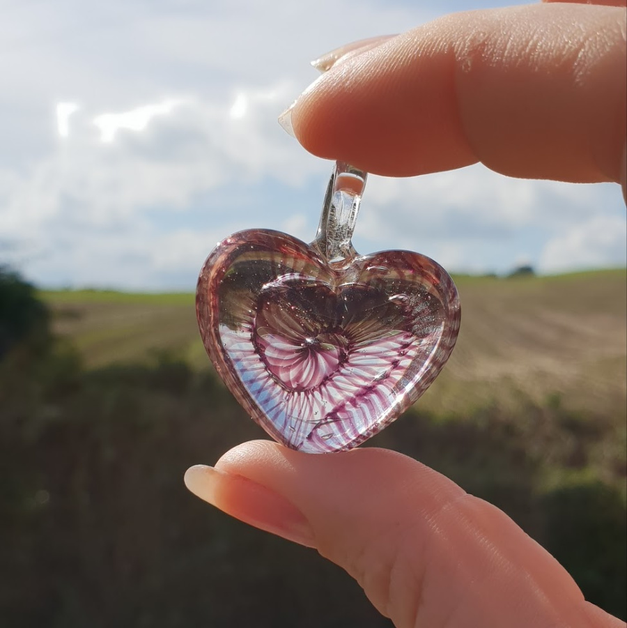 With aubergine coloured ribbons flowing through this otherwise see-through glass heart, this is a truly unique piece of hand crafted glass jewellery.