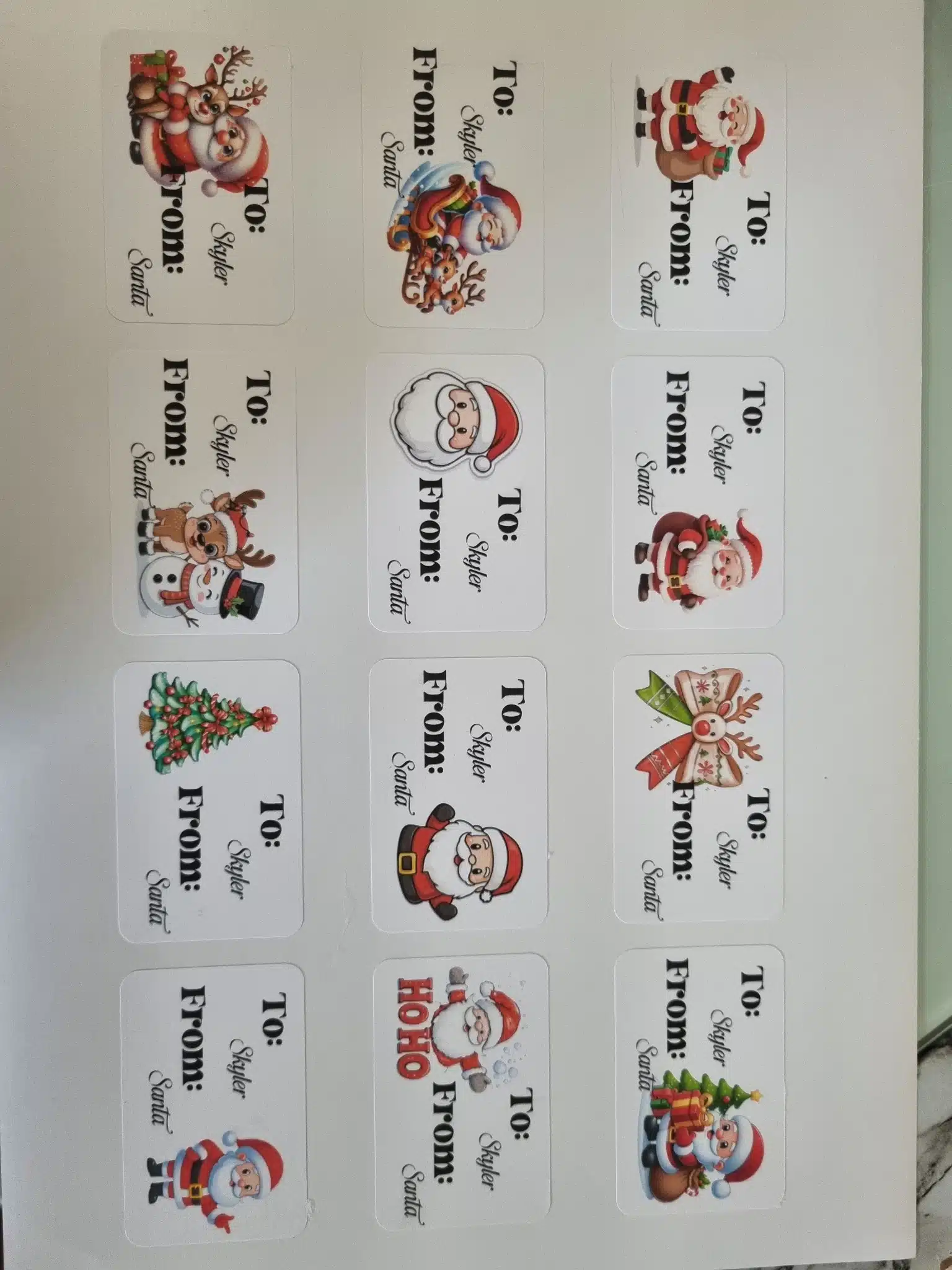 Add a festive touch to your holiday gifts with these adorable Santa Christmas Gift Labels! Each sheet includes 12 fun and colorful stickers, perfect for labeling presents from Santa or family.