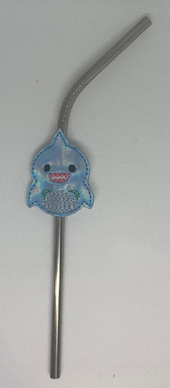 Shark straw hugger or topper. Embroidered onto vinyl or faux leather. The straw fits through the gaps top and bottom between the front and back of the hugger so once the straw has been used, the hugger can easily be removed while the straw is cleaned. Helps to ensure people know which drink is who’s and avoid cross-contamination for those with allergies.