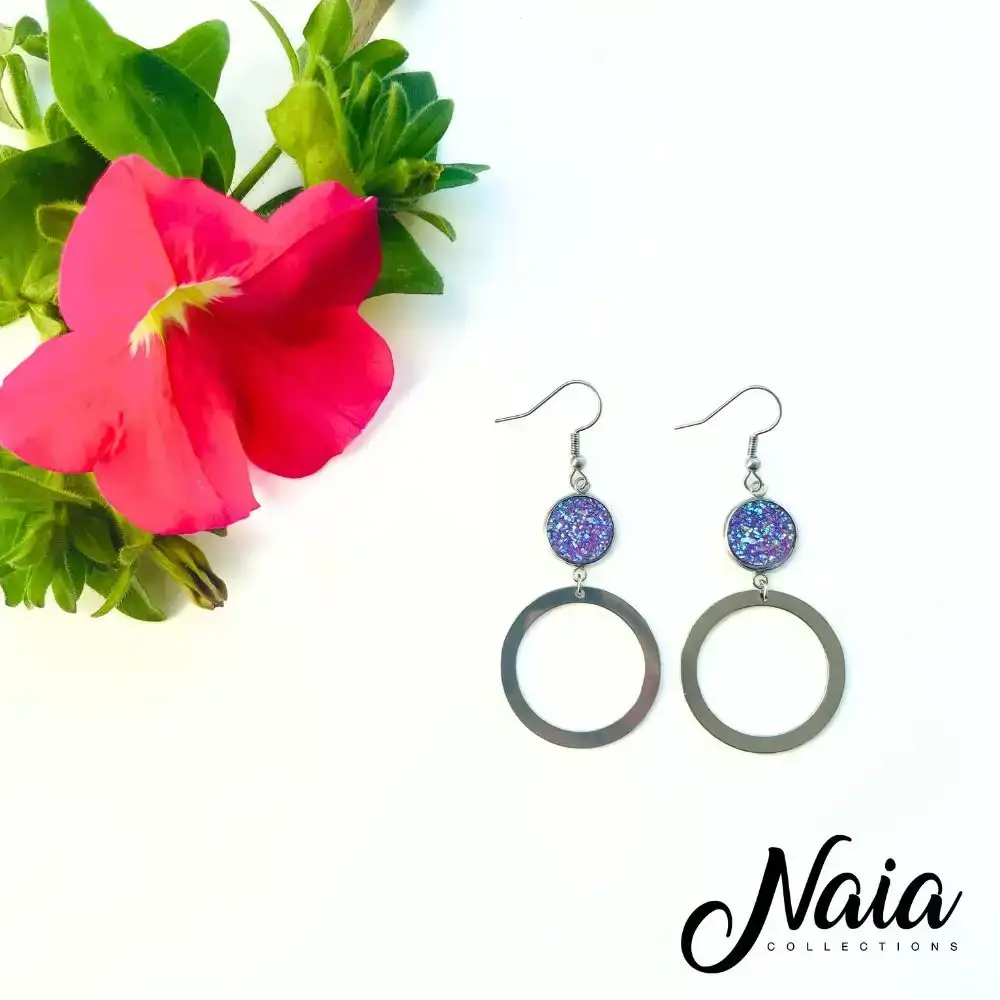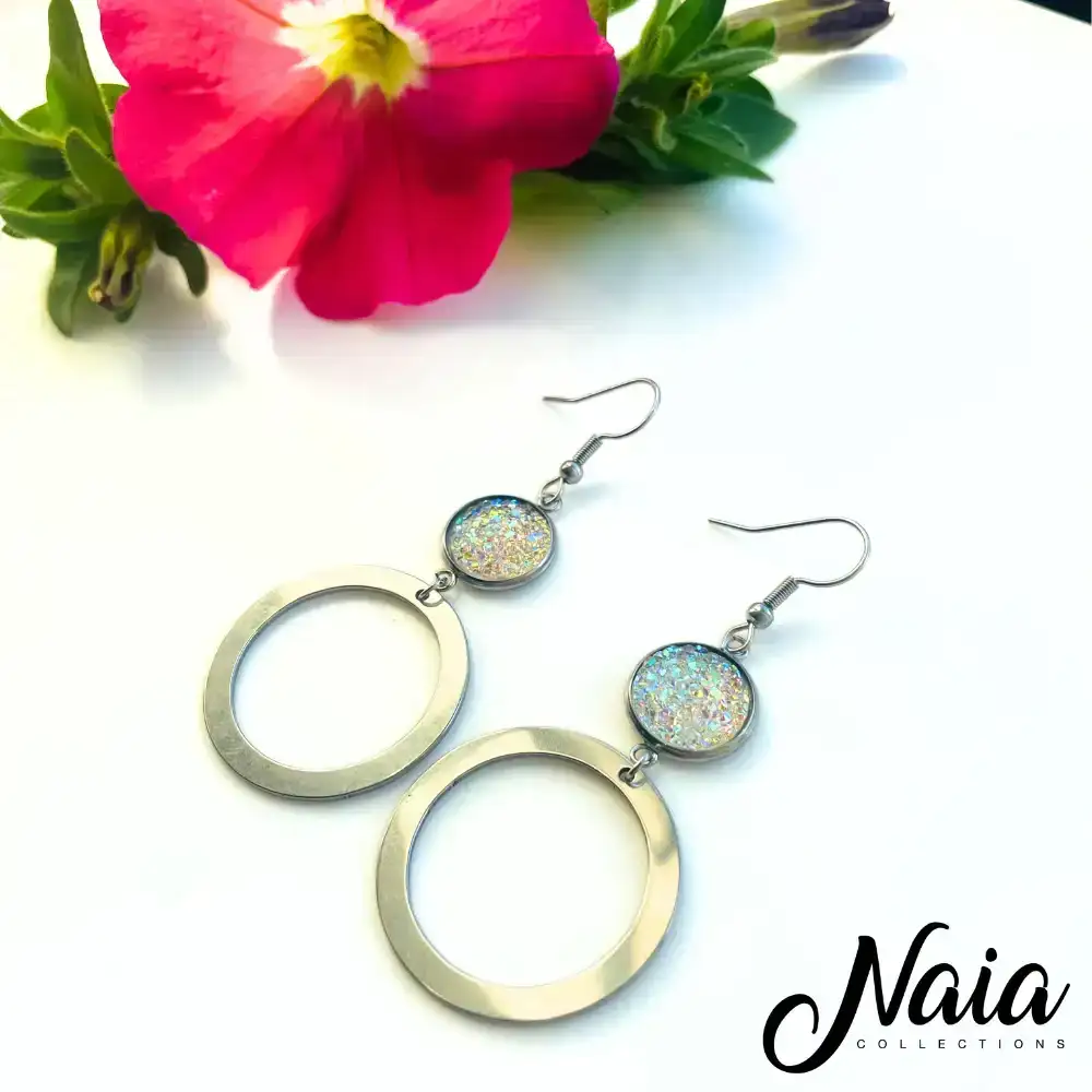 Turn heads and light up the room with these ultra-glam sparkly hoop earrings. The sparkly druzy bead measures approximately 1.2cm diameter with the full earring length being approximately 6cm from top to bottom. These earrings are 316 stainless including the hooks which are perfect for those with sensitive ears (excluding the druzy bead).