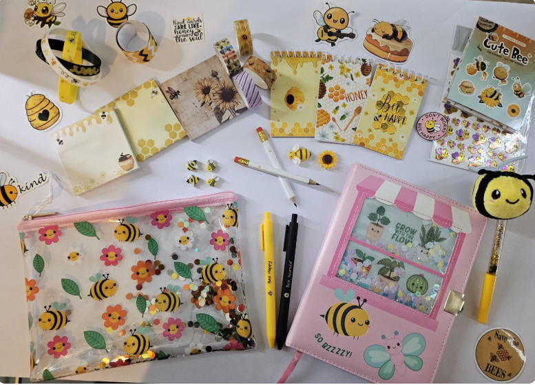 Accessories: Iron-on patches, transfer stickers, bracelets, scrunchies, straw toppers, key rings, mini purse/key charms, loose charms, enamel pins, drawstring or small bee themed tote bags and more.