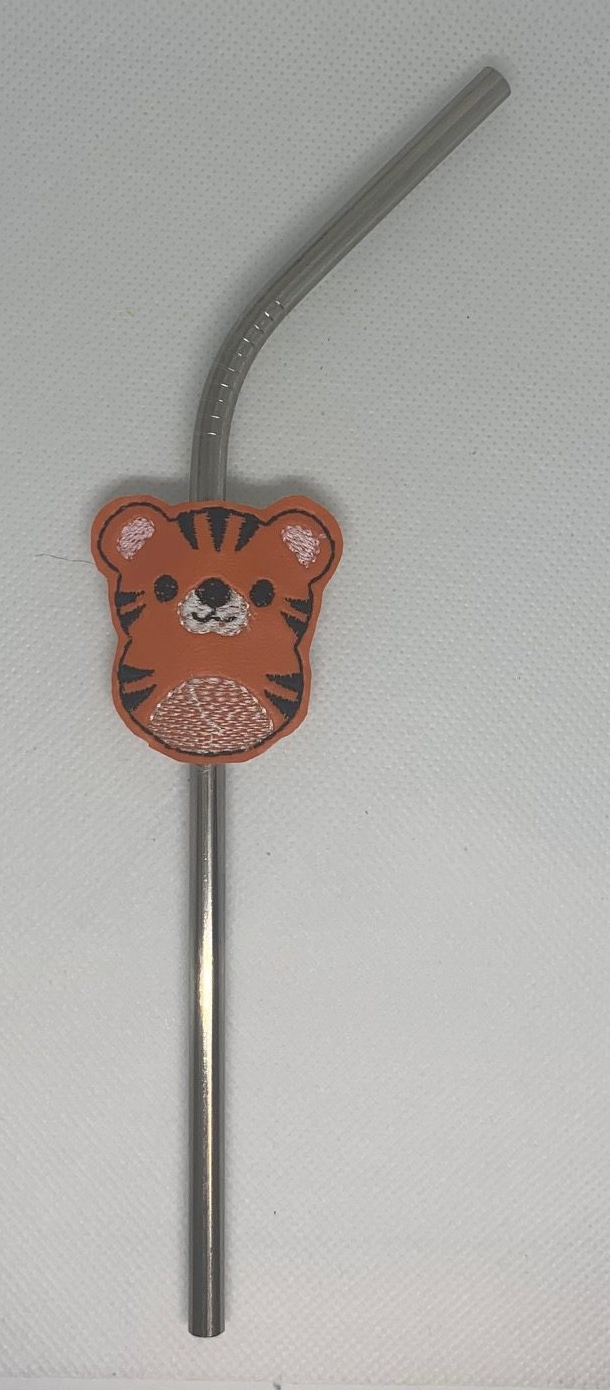 Tiger straw hugger or topper. Embroidered onto vinyl or faux leather. The straw fits through the gaps top and bottom between the front and back of the hugger so once the straw has been used, the hugger can easily be removed while the straw is cleaned. Helps to ensure people know which drink is who’s and avoid cross-contamination for those with allergies.