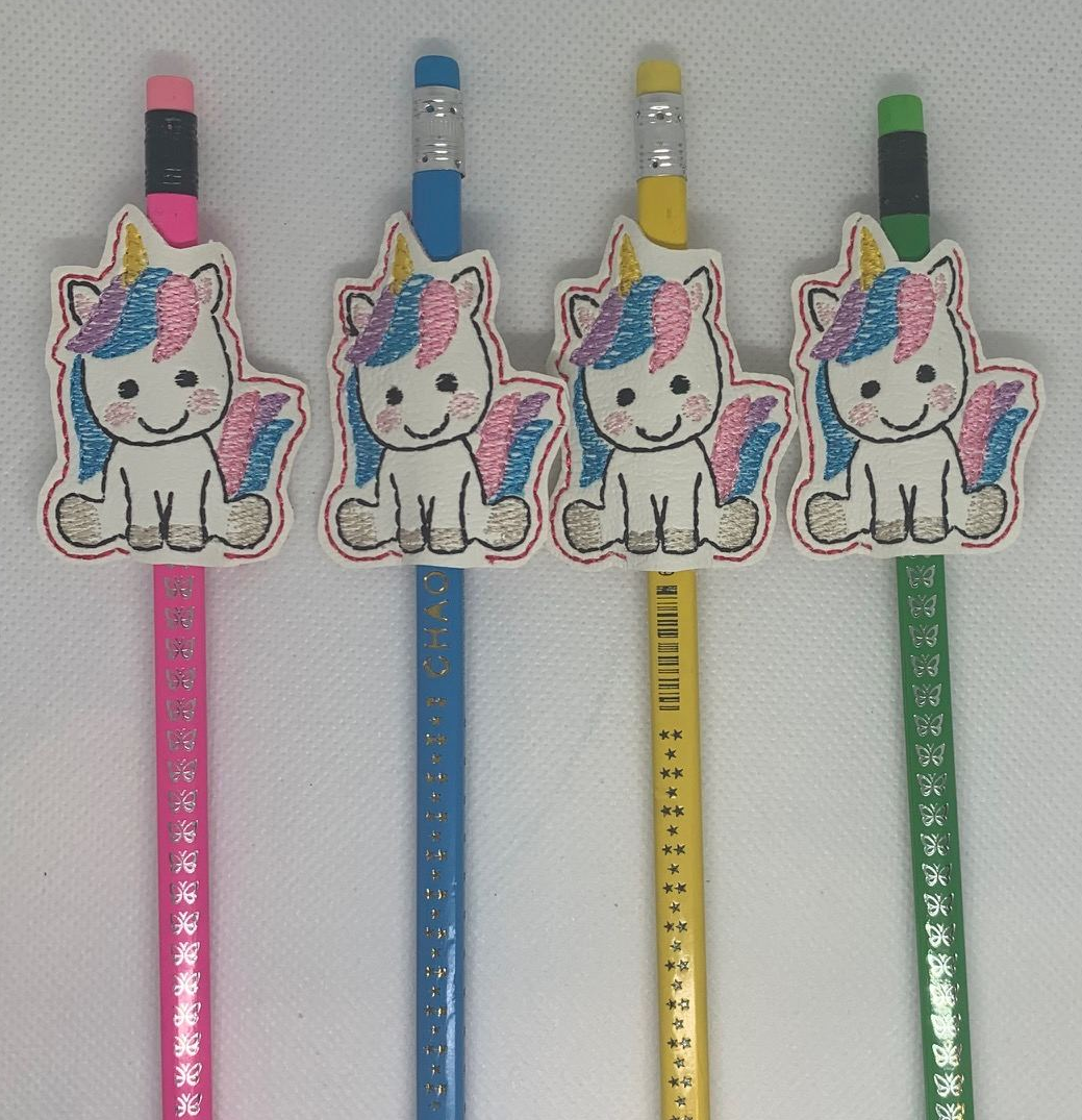 Unicorn pencil hugger or topper. Embroidered onto vinyl or faux leather. The pencil, pen, felt etc fits through the gaps top and bottom between the front and back of the hugger, so when the pencil has been used up, the hugger can be easily transferred to another pencil.