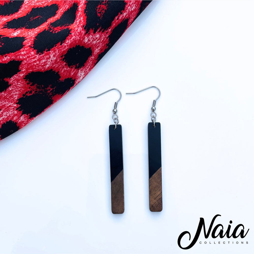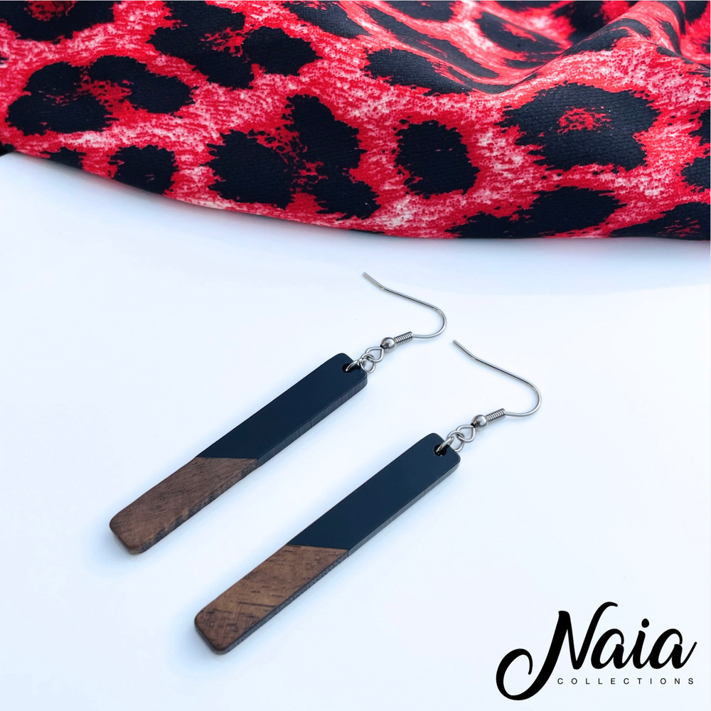 These sleek dangle earrings feature a striking blend of natural wood and black resin on stainless steel hooks perfect for those with sensitive ears. They are lightweight, elegant and easy to wear from day to night.