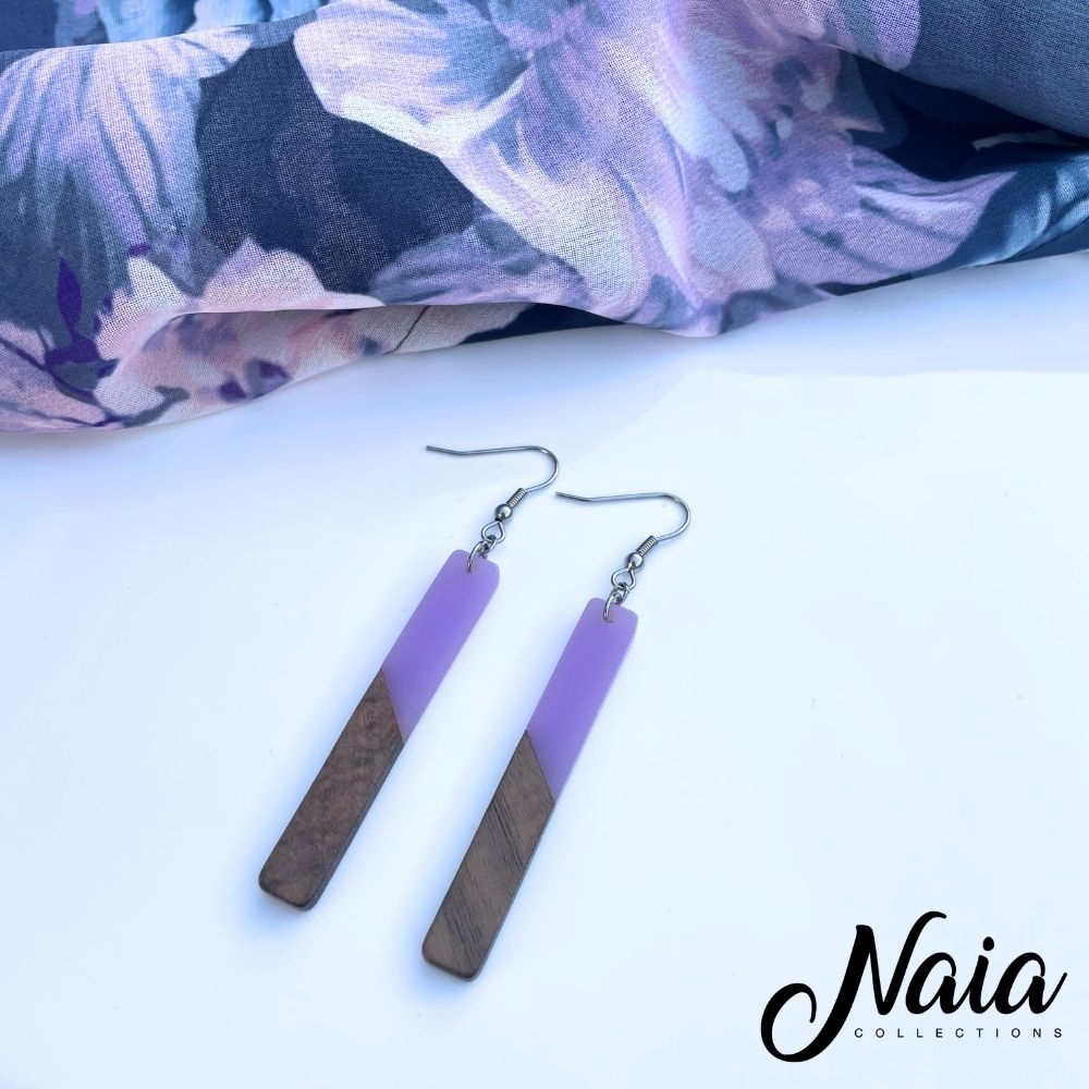 These sleek dangle earrings feature a striking blend of natural wood and purple resin on stainless steel hooks perfect for those with sensitive ears. They are lightweight, elegant and easy to wear from day to night.