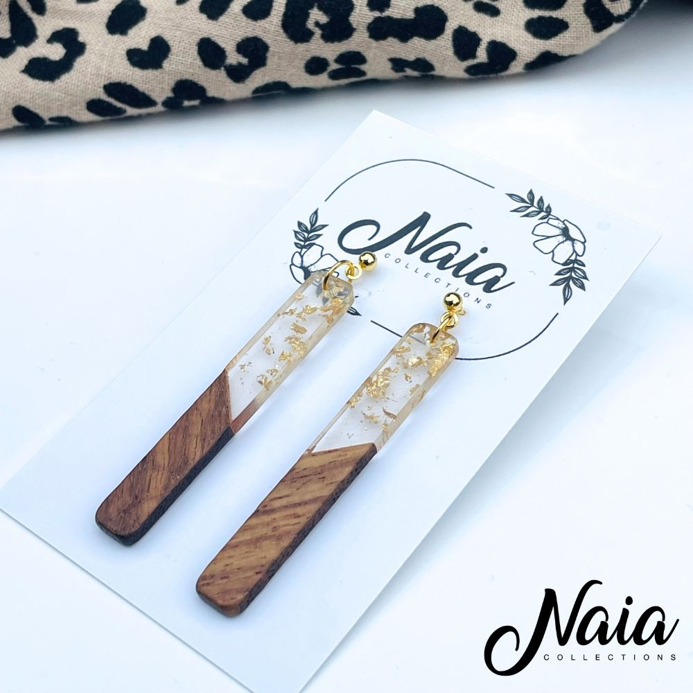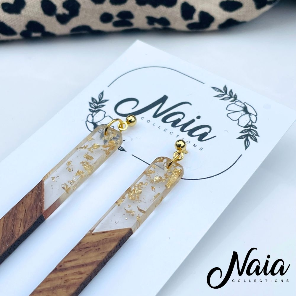 These sleek dangle earrings feature a striking blend of natural wood and clear resin, finished with delicate gold flecks for subtle sparkle. Paired with a classic ball and link gold plated stud top. They are lightweight, elegant and easy to wear from day to night. Alternatively if you would like them on stainless steel hooks please use the option provided.